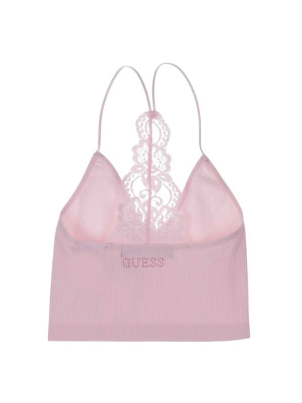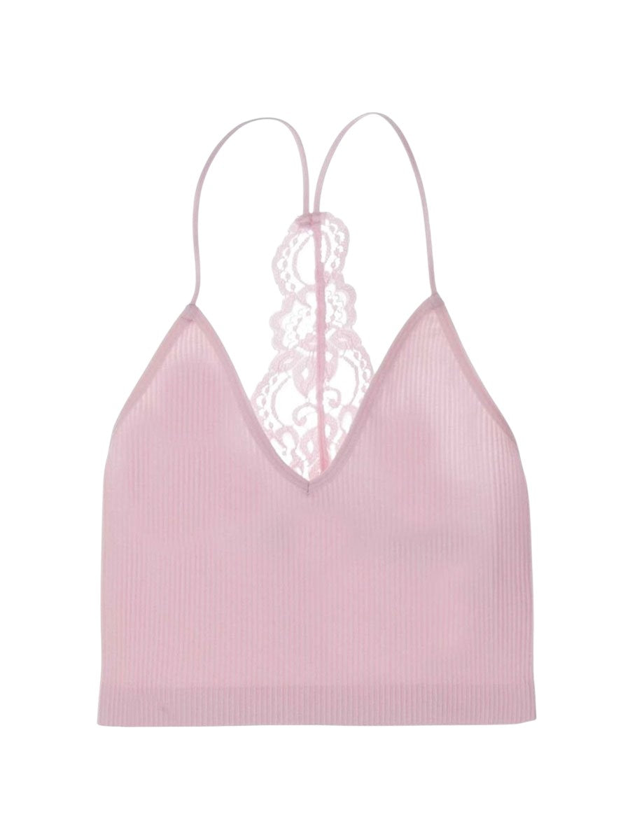 Címke nélküli, rózsaszín, bordázott szövet, testhezálló/crop fazon, V-nyakkivágás, vékony pántok, csipke betét a háton.