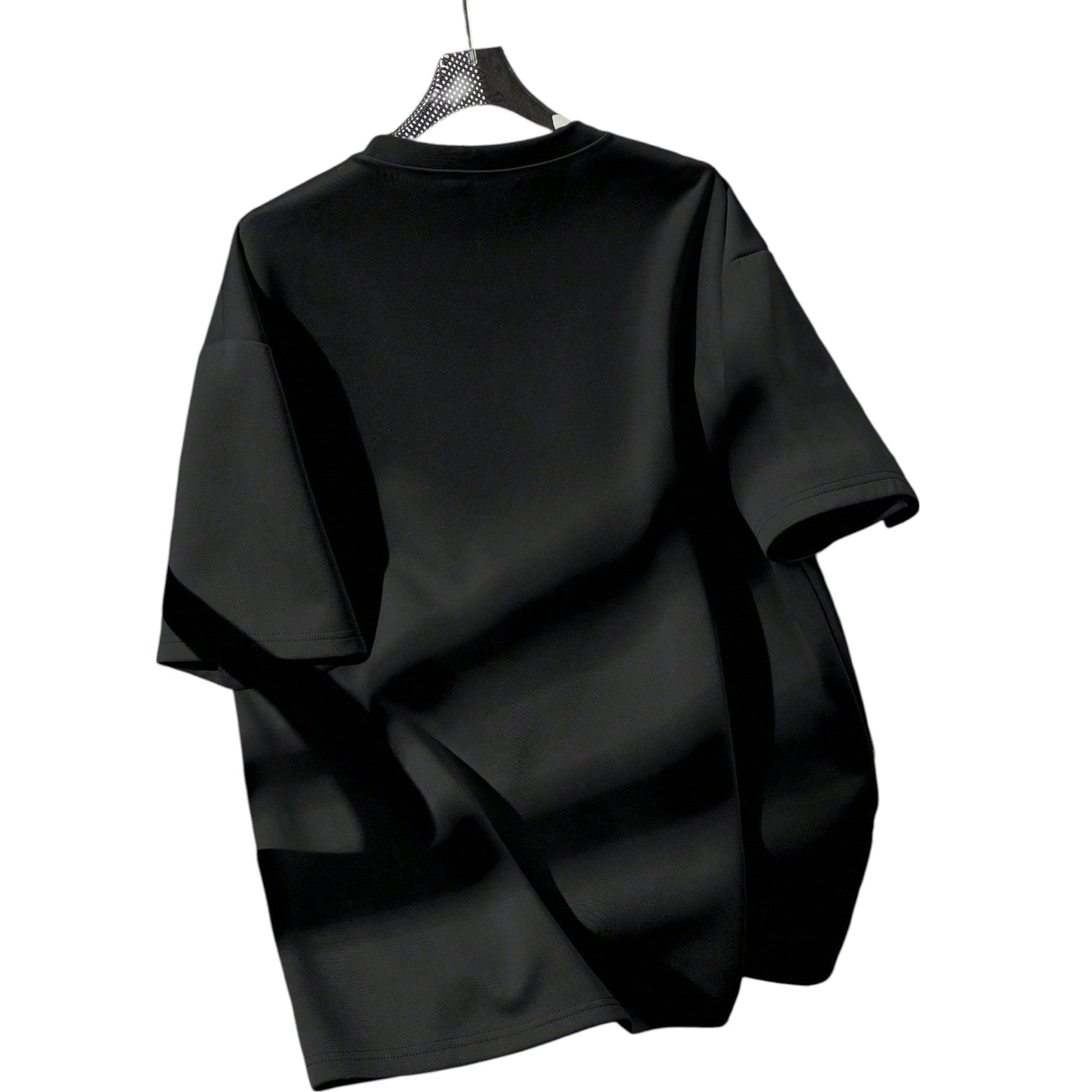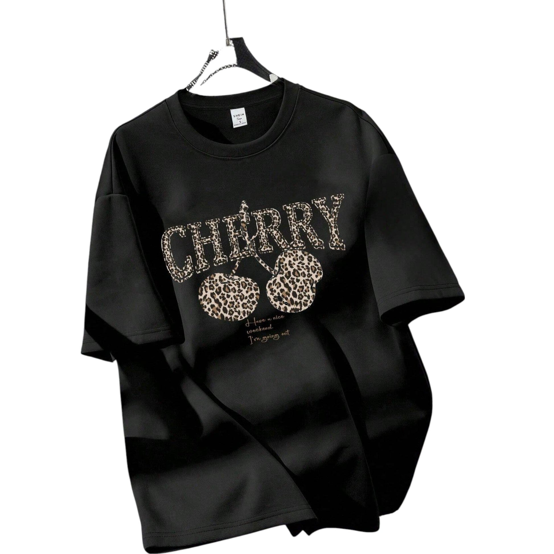 Címke nélküli, fekete, rövid ujjú póló, elöl "CHERRY" felirattal és cseresznye mintával, ami leopárd mintás.