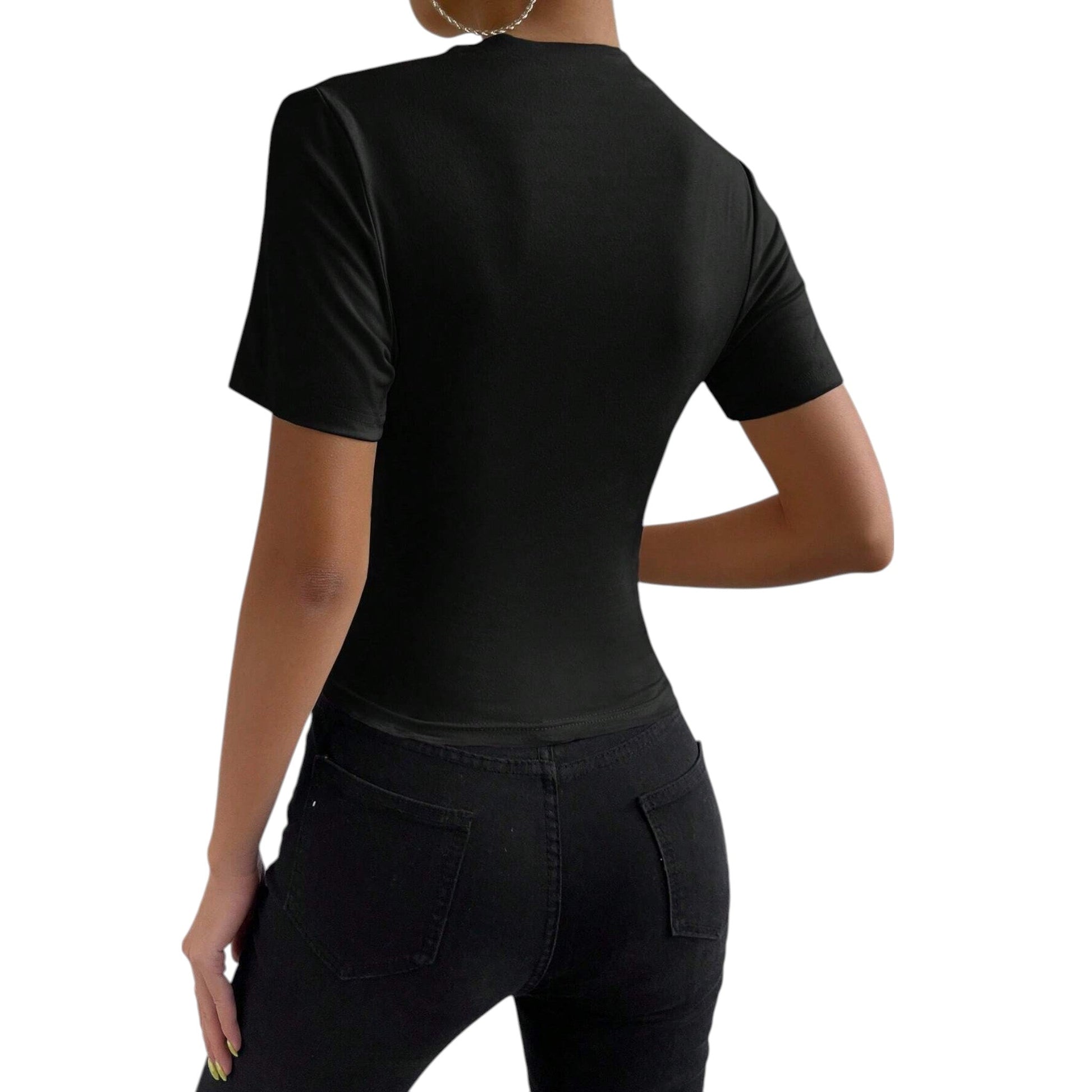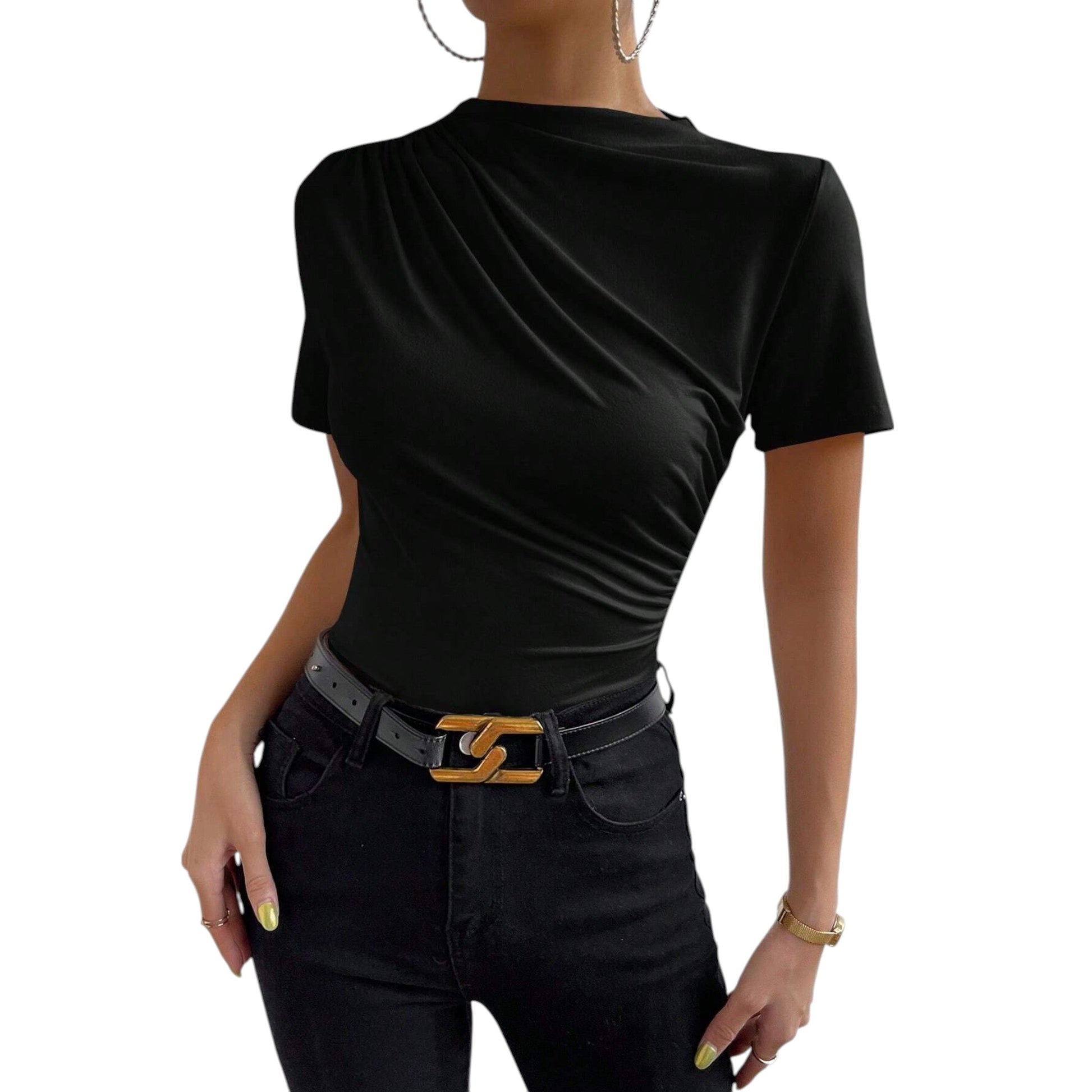 Címke nélküli, fekete színű, rövid ujjú, kerek nyakú póló, ráncolt oldaldíszítéssel.