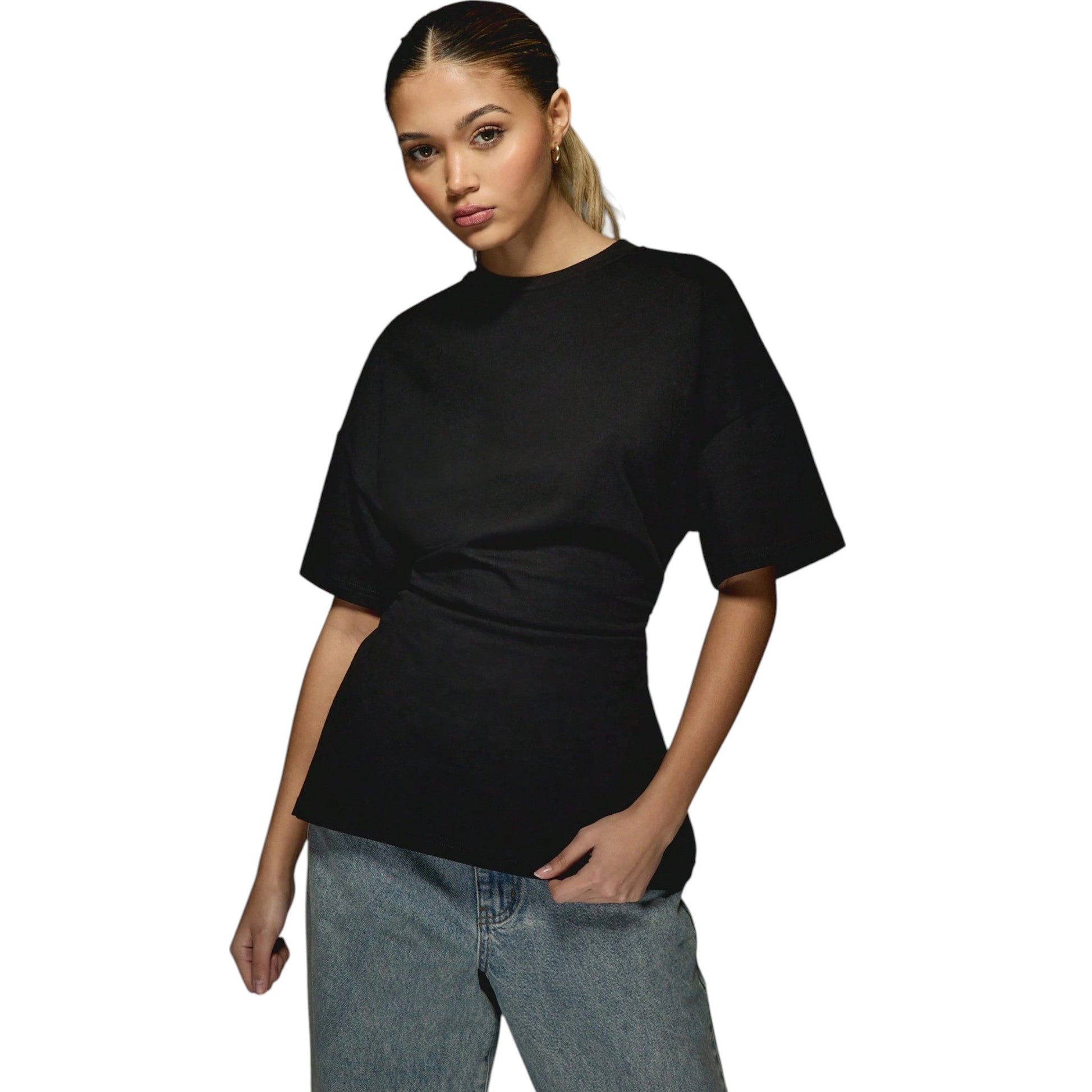Címke nélküli, fekete, rövid ujjú, kerek nyakú, bő szabású, derékon ráncolt részlettel.