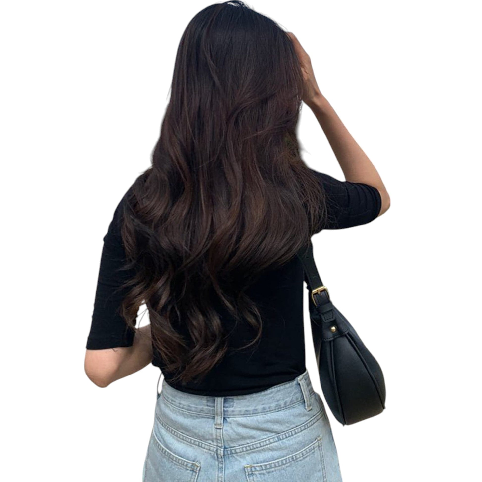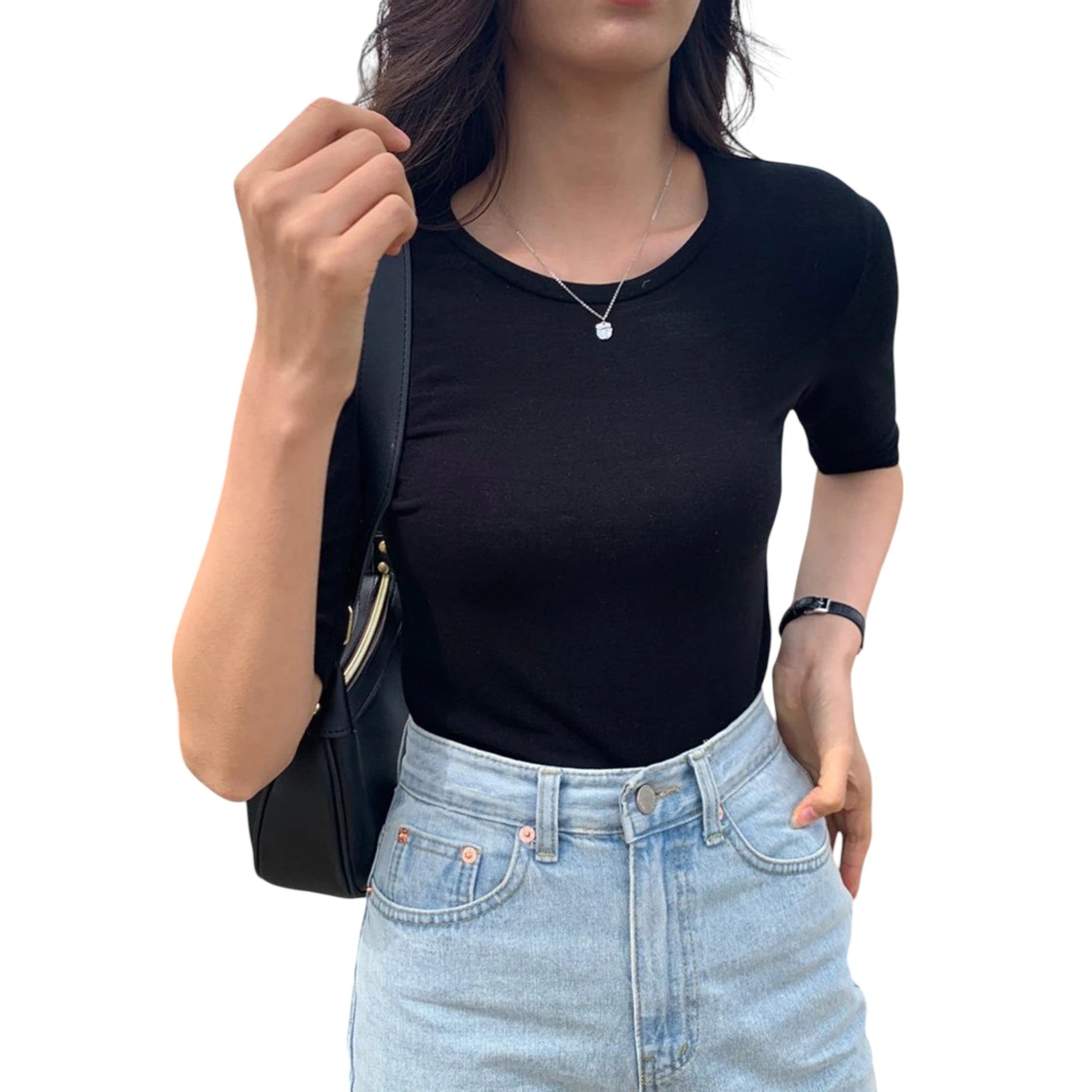 Címke nélküli, fekete, rövid ujjú, kerek nyakú póló.