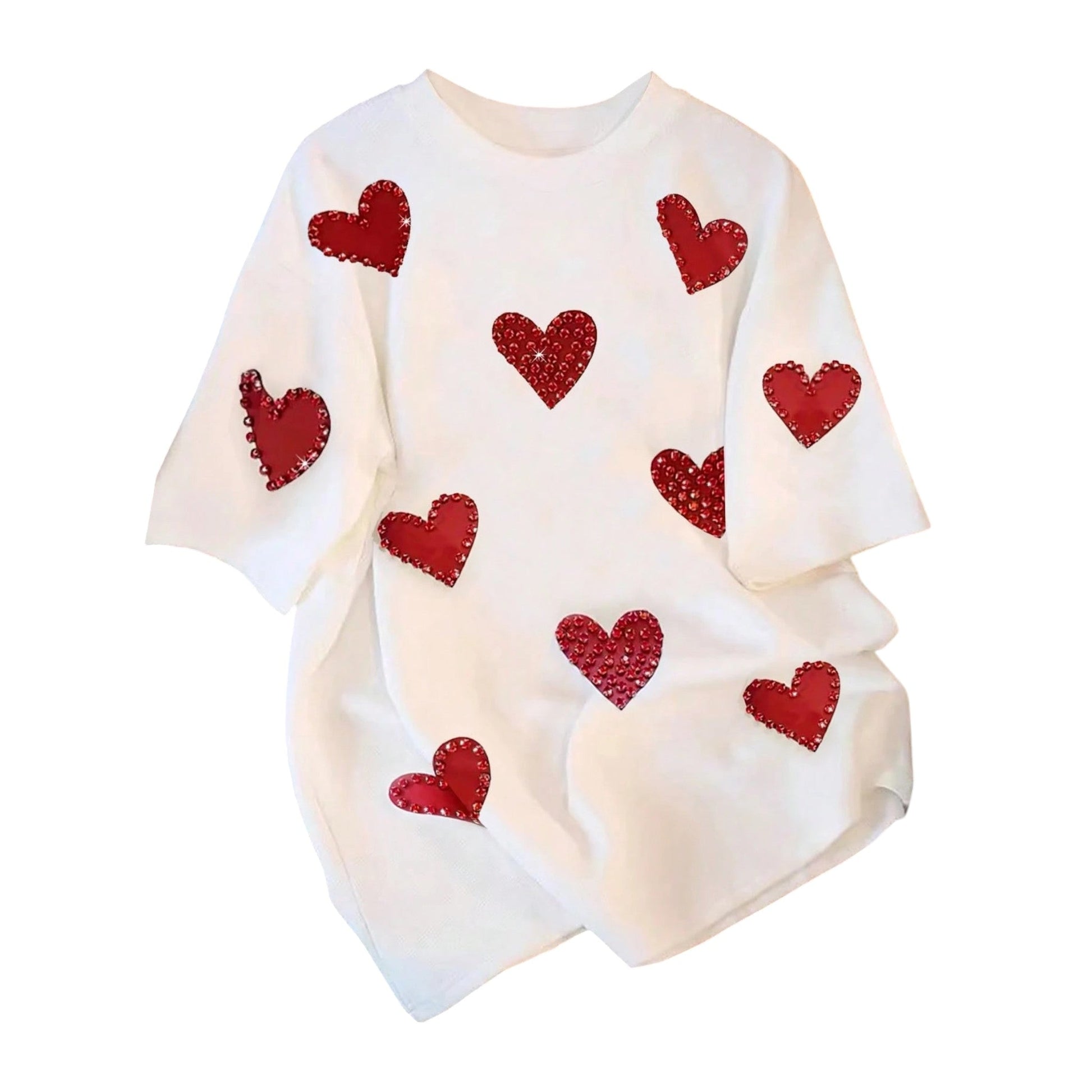 Címke nélküli, fehér, kerek nyakú, rövid ujjú póló piros szív mintákkal.