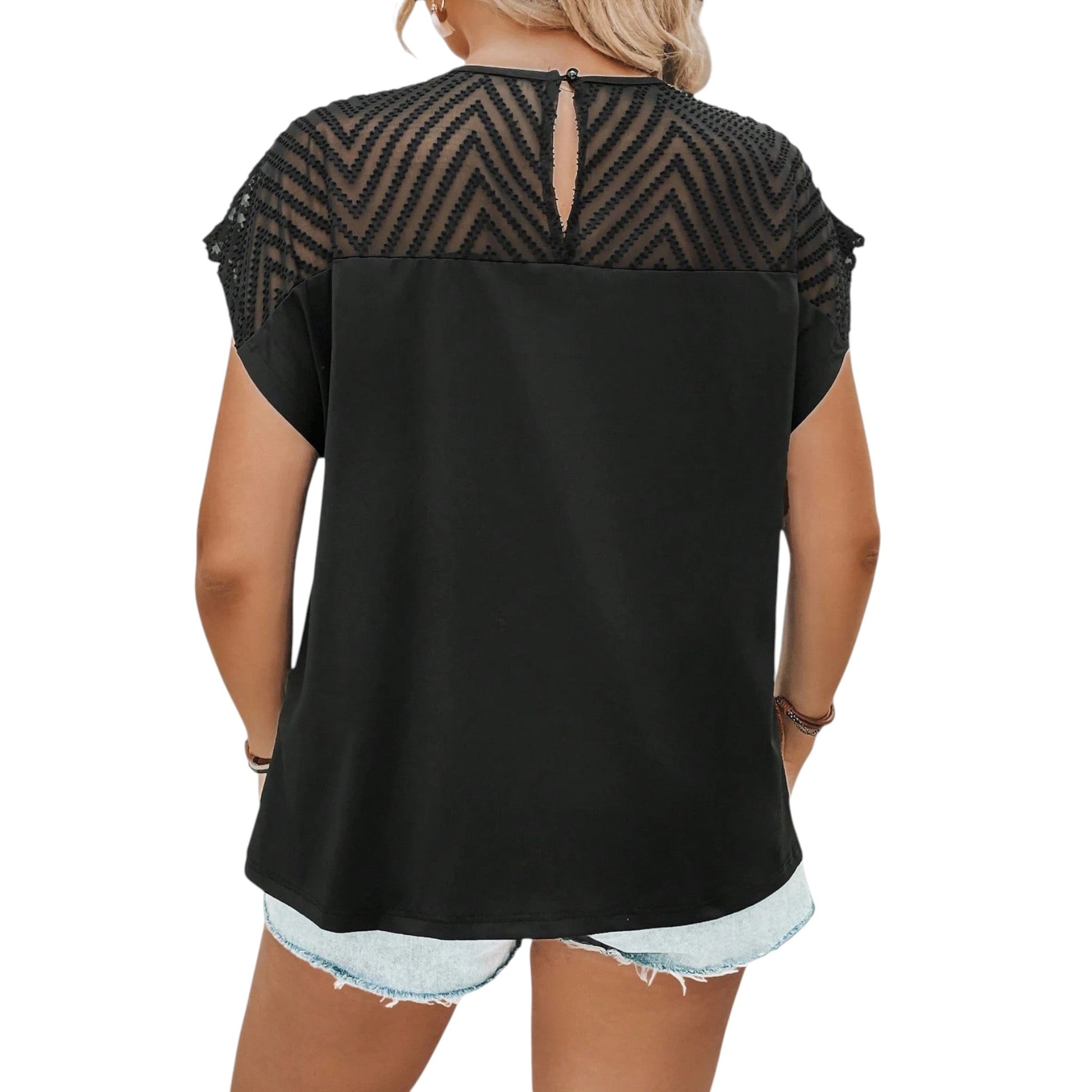 Címke nélküli, fekete, rövid ujjú, kerek nyakú, mellrészen átlátszó, chevron mintás hálóval díszített.