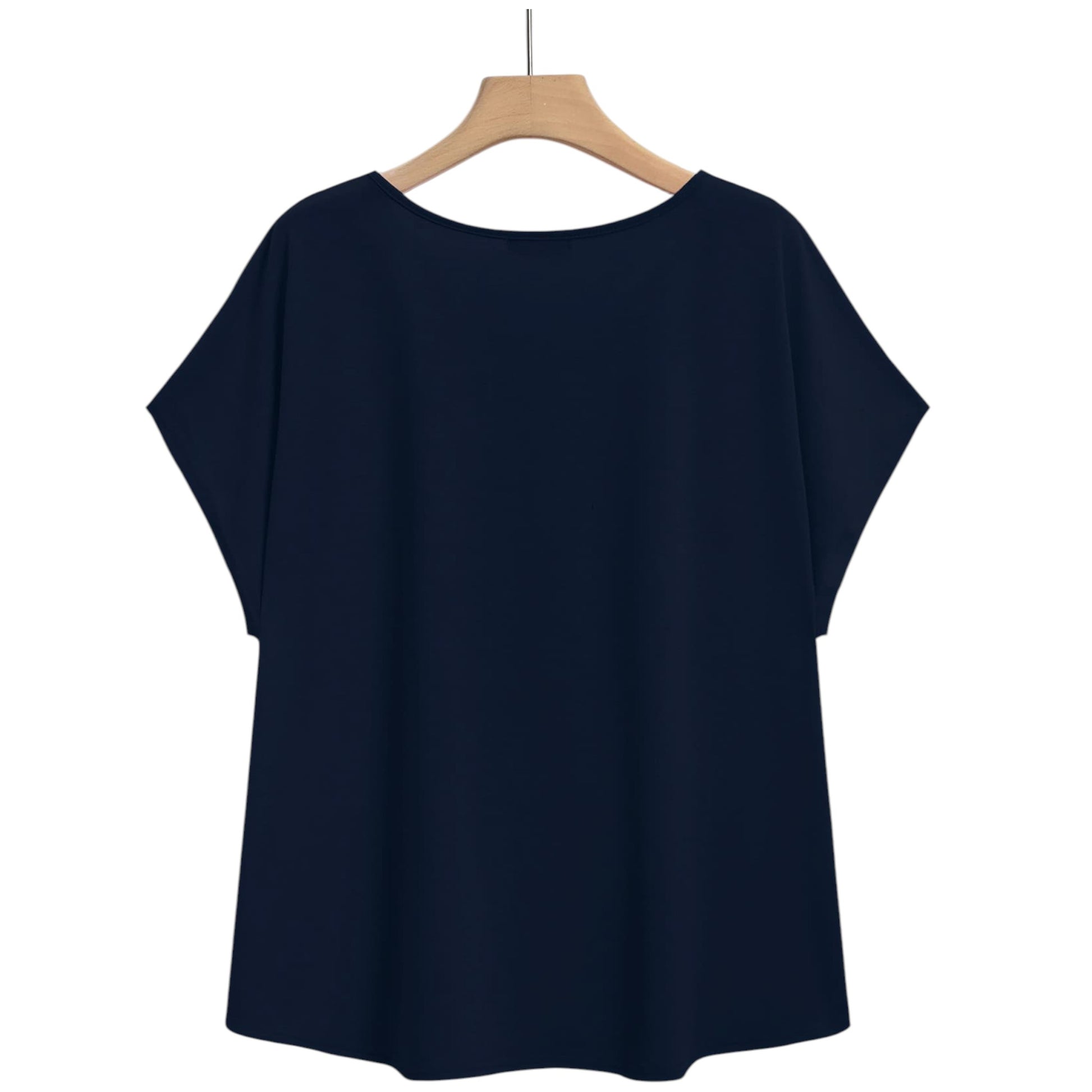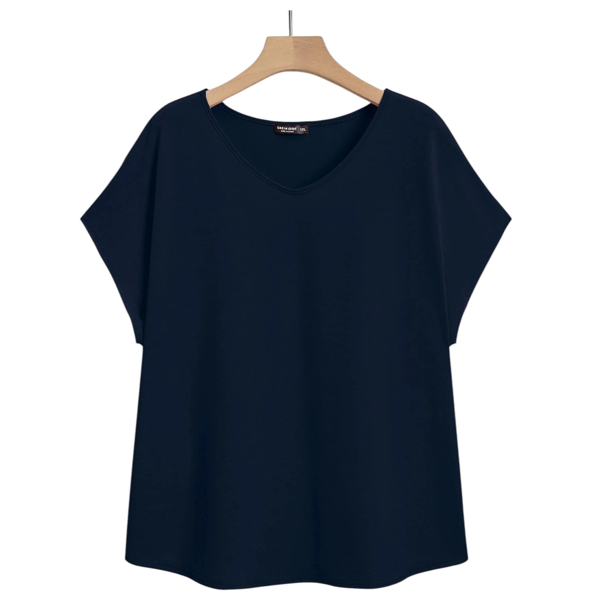 Címke nélküli, sötétkék, V-nyakú, rövid ujjú.