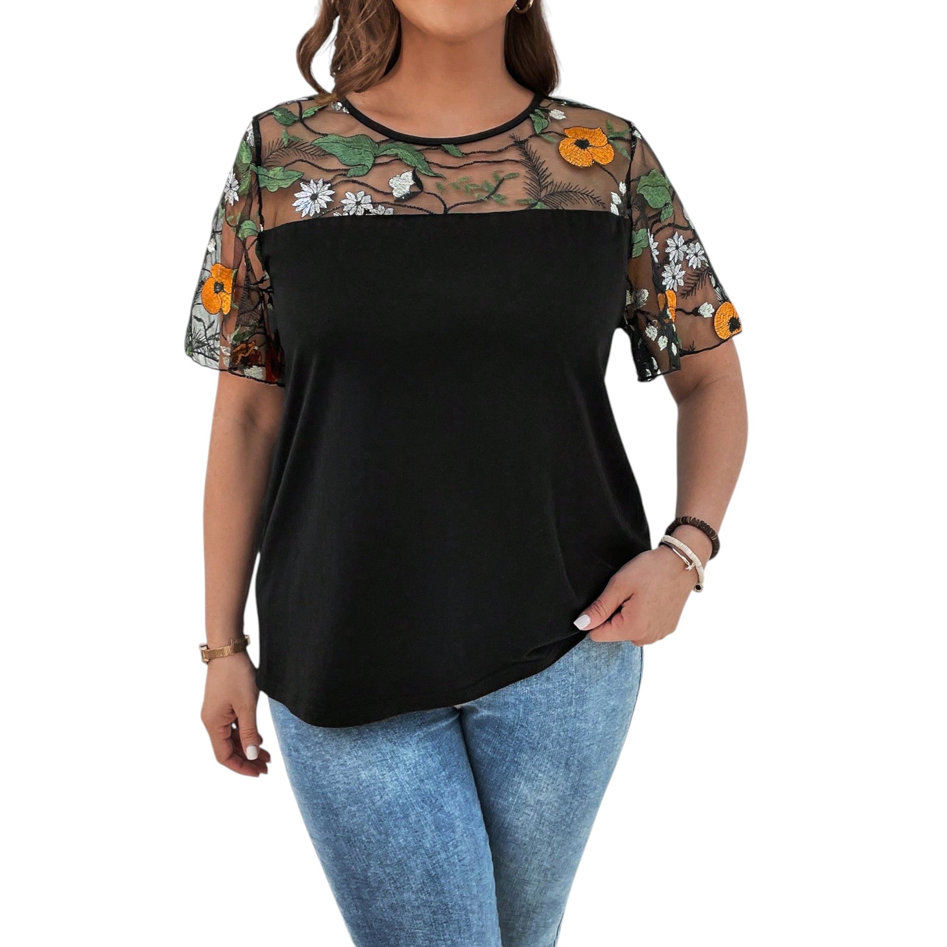 Címke nélküli, fekete, rövid ujjú, hímzett, áttetsző anyaggal díszített, kerek nyakú felső.
