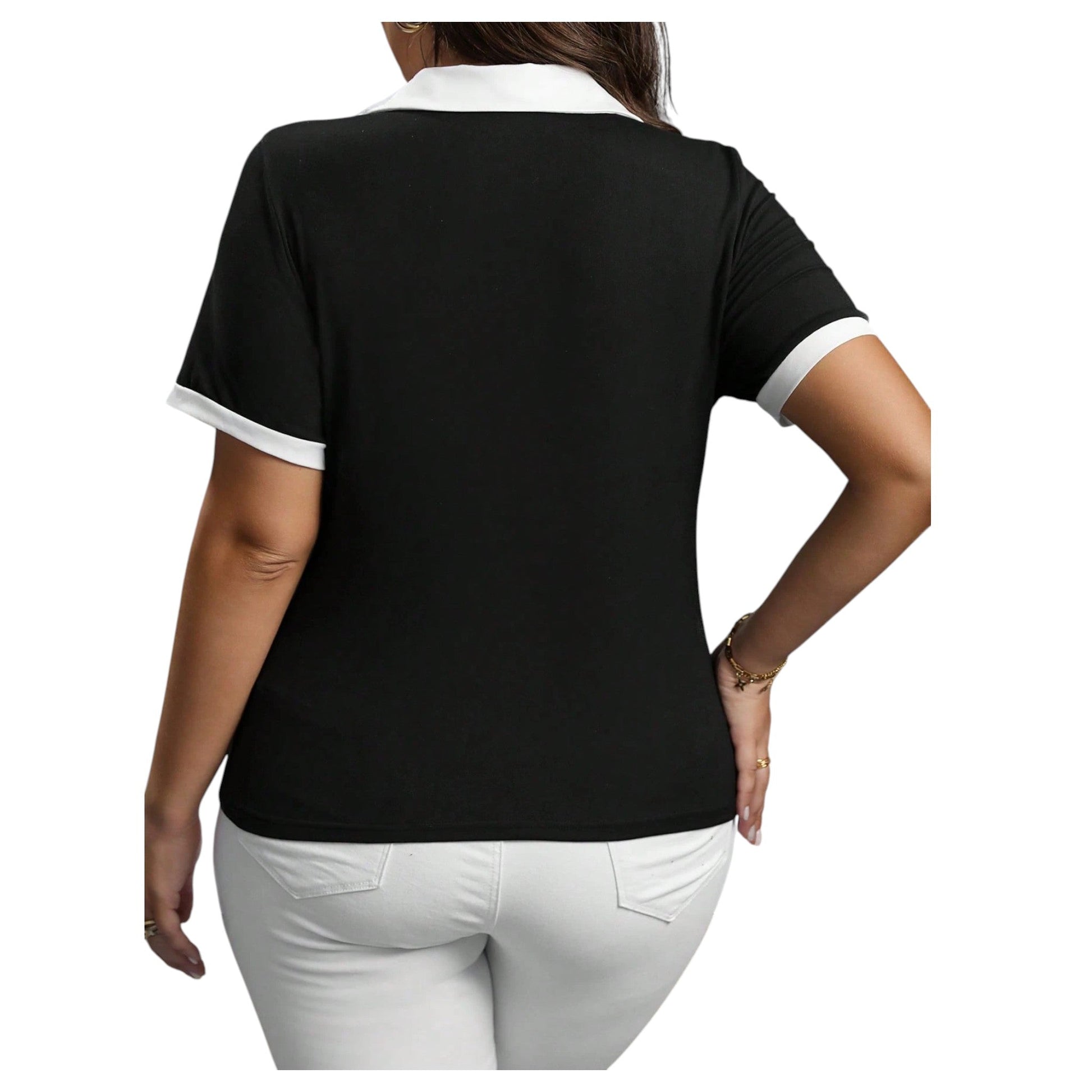 Címke nélküli, fekete, rövid ujjú, galléros, V-nyakú póló fehér passzéval.
