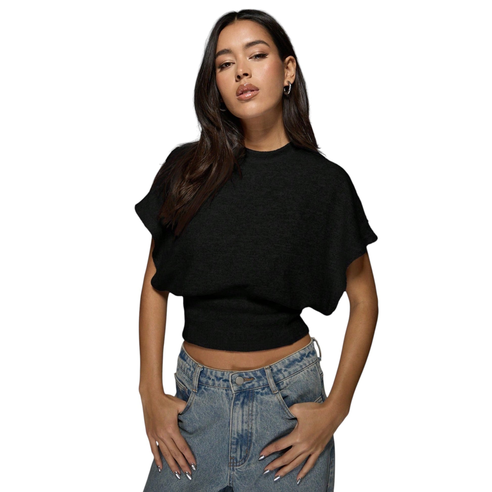 Címke nélküli, fekete, crop top fazon, kerek nyakú, bő denevérujjú, széles, passzés derékrész.