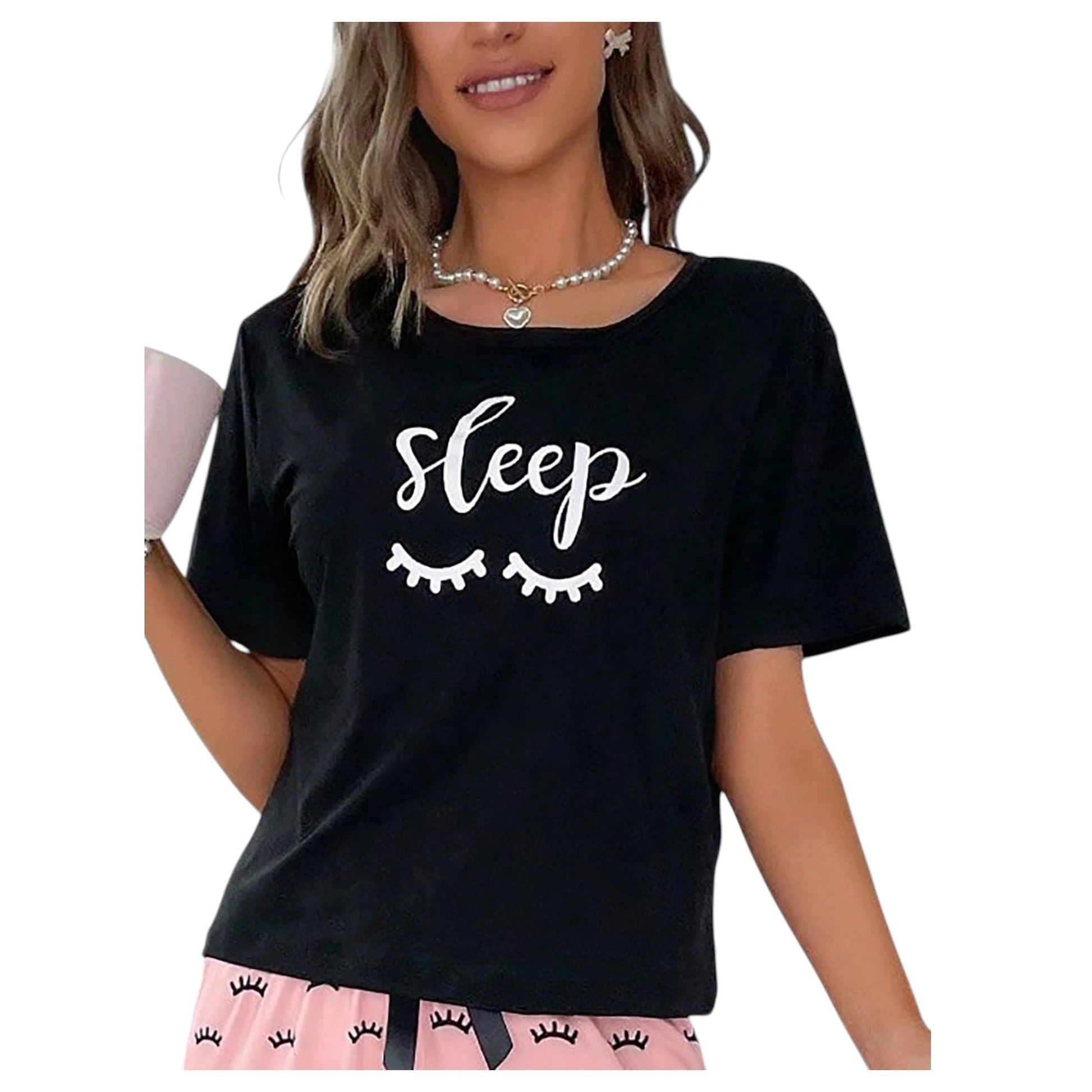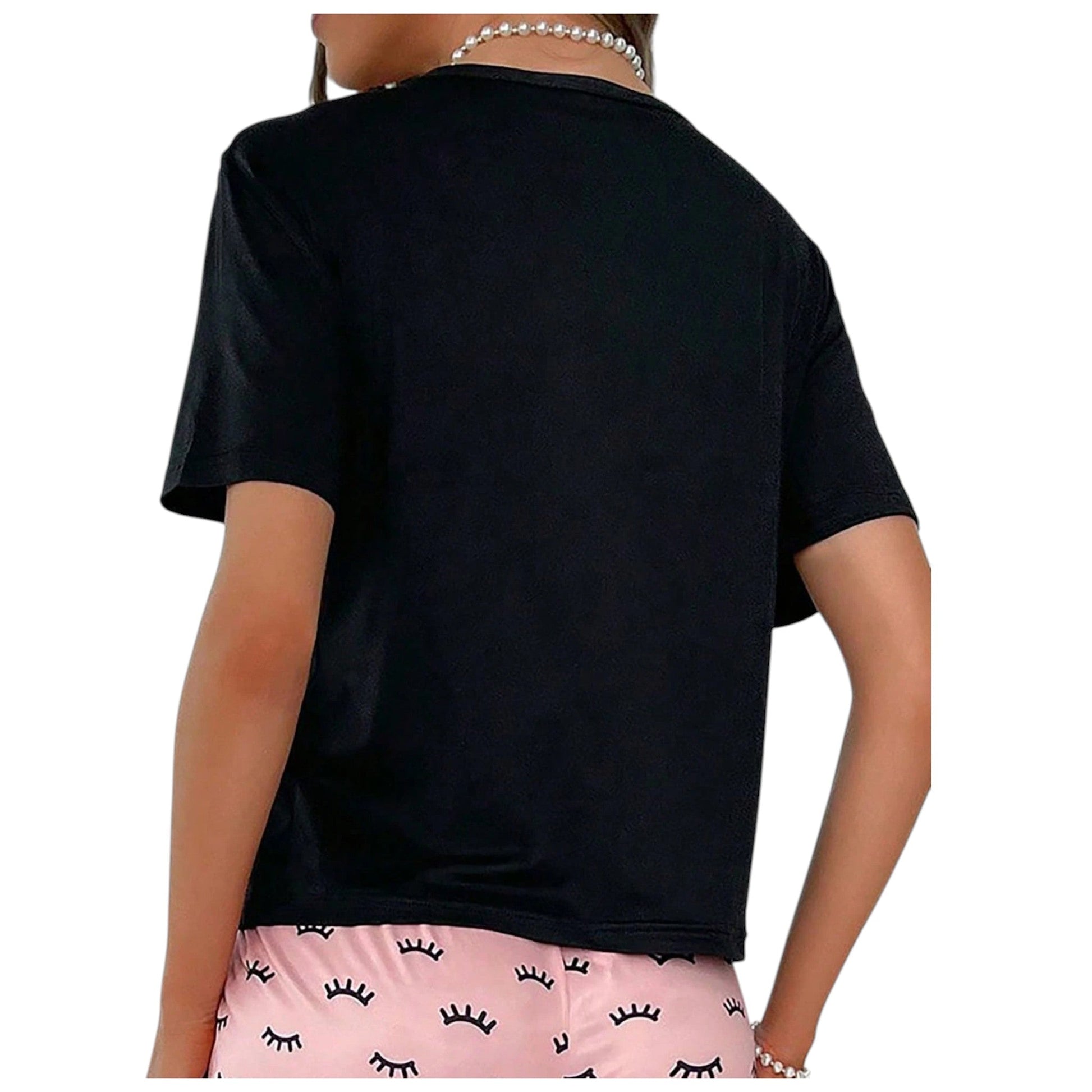 Címke nélküli, fekete, "sleep" és szempilla mintával, rövid ujjú, kerek nyakú.