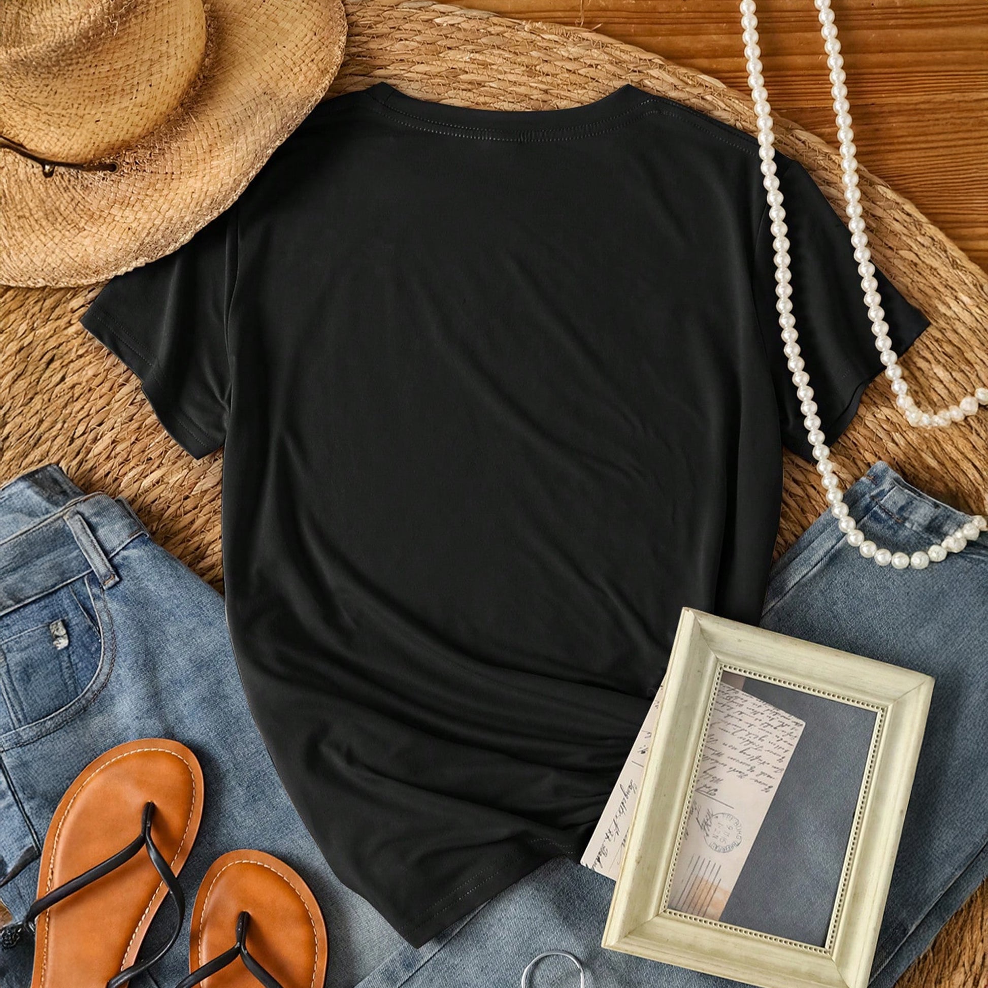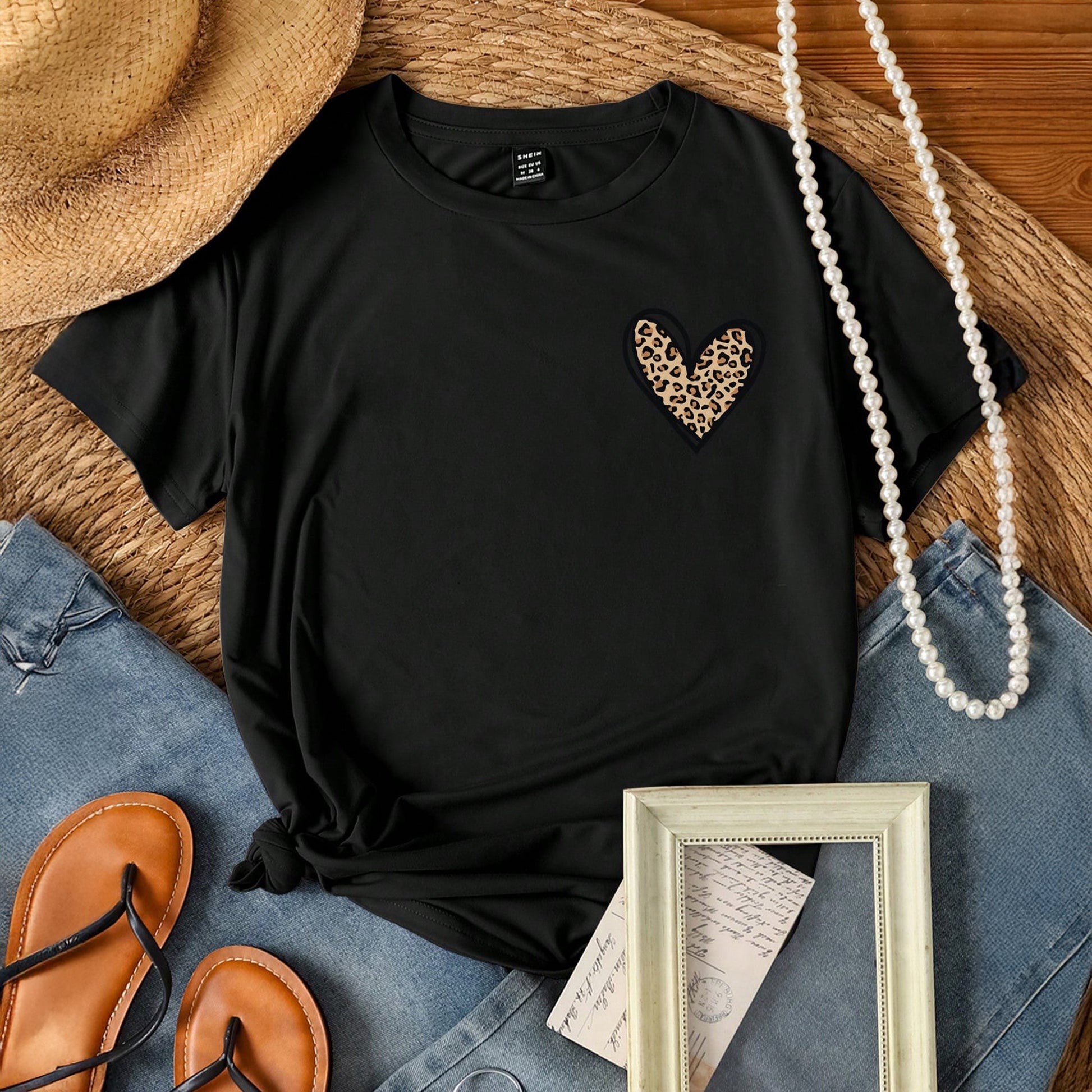 Címke nélküli, fekete, leopárdmintás szív rátét, rövid ujjú, kerek nyakú.