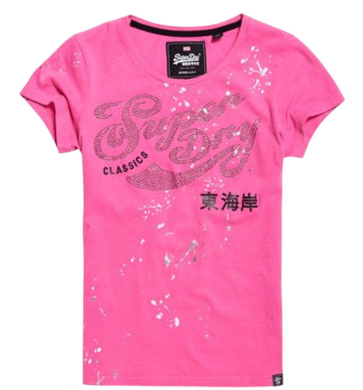 Címke nélküli, pink, pamutdzsörzé, testhezálló póló fazon, kerek nyakkivágás, rövid ujjak, "SuperDry CLASSICS" strasszköves és japán feliratos grafika, festékfröccsenés hatás.