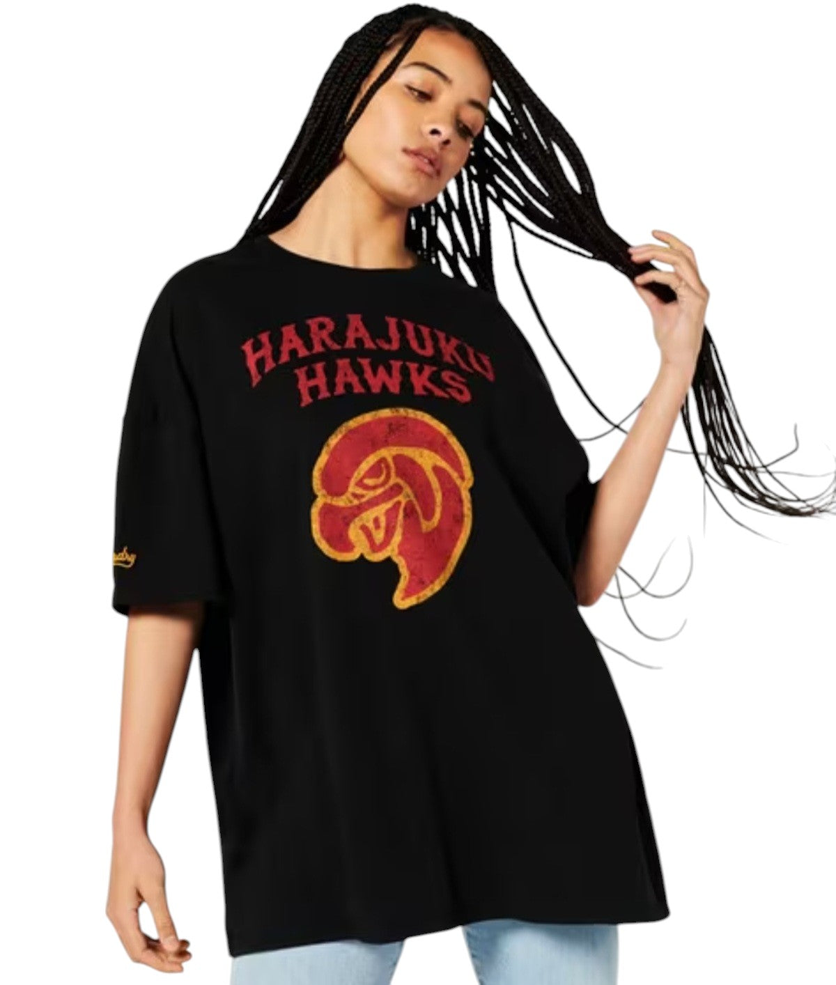 Címke nélküli, fekete, pamut, oversized fazon, kerek nyak, rövid, bő ujj, "HARAKUJU HAWKS" felirat és sólyomfej grafika piros és sárga színben.