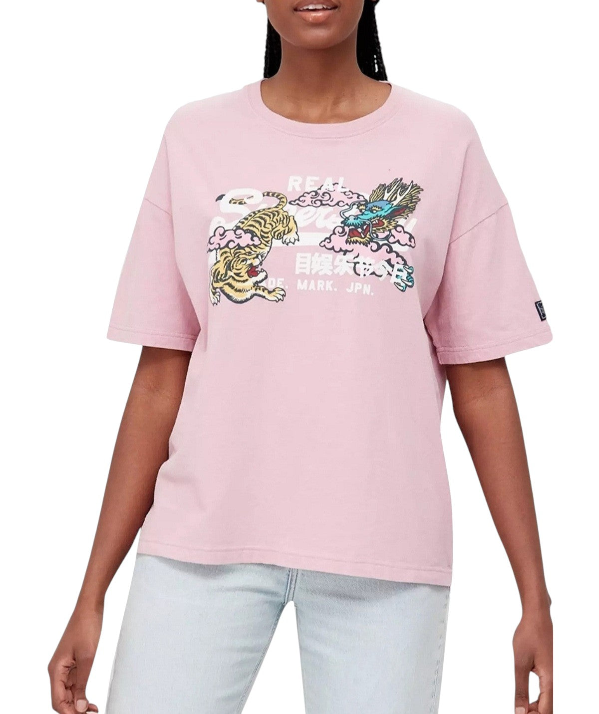 Címke nélküli, rózsaszín, pamut, oversized fazon, kerek nyak, rövid, bő ujj, tigris és sárkány küzdelmét ábrázoló japán stílusú grafika, "REAL" és japán feliratok.