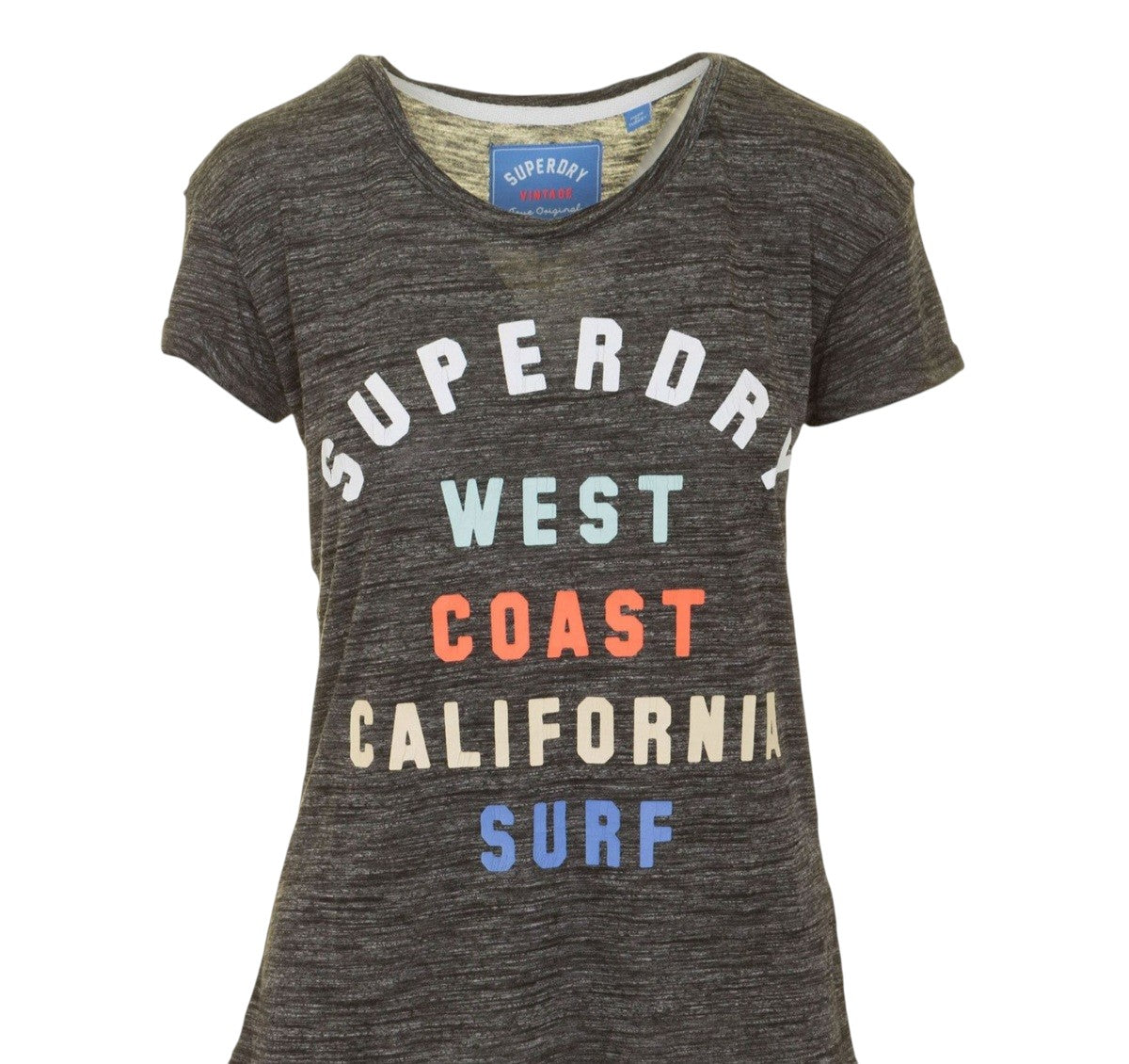 Címke nélküli, sötétszürke melírozott, pamut, laza fazon, kerek nyak, rövid ujj, "SUPERDRY WEST COAST CALIFORNIA SURF" felirat fehér, türkiz, narancs és bézs színekben.