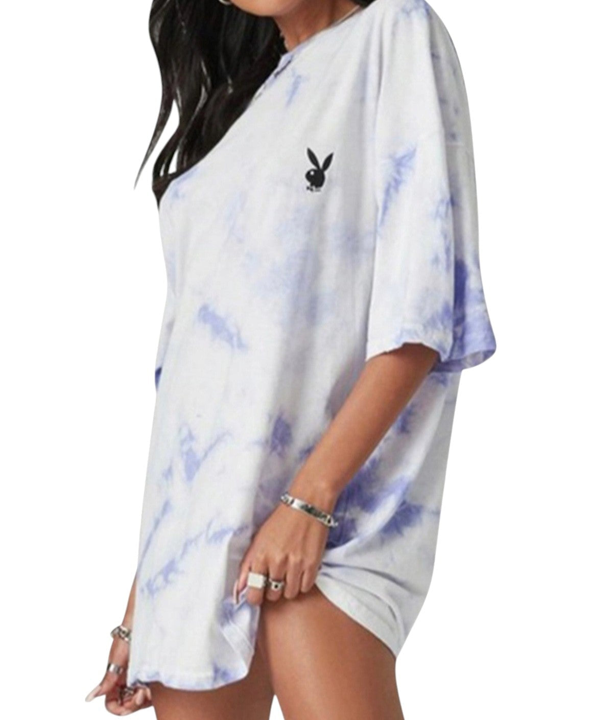 Címke nélküli, lila és fehér batikolt, pamut, oversized póló fazon, kerek nyakkivágás, rövid, bő ujjak, kis fekete Playboy nyuszi logó a mellkason.
