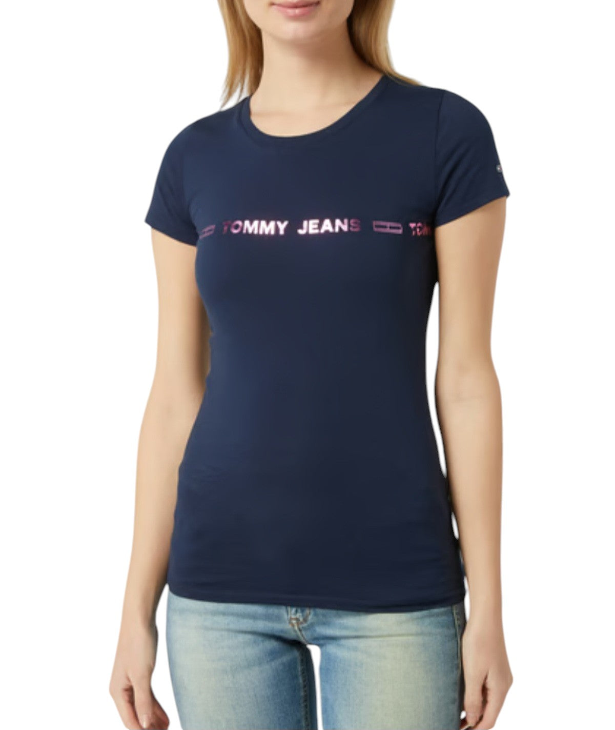 Címke nélküli, sötétkék, pamut, testhezálló fazon, kerek nyak, rövid ujj, rózsaszín "TOMMY JEANS" felirat és kis zászló logó.