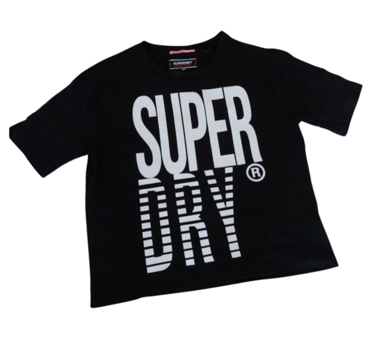 Címke nélküli, fekete, pamut, oversized fazon, kerek nyak, rövid, bő ujj, nagyméretű fehér "SUPER DRY" felirat.