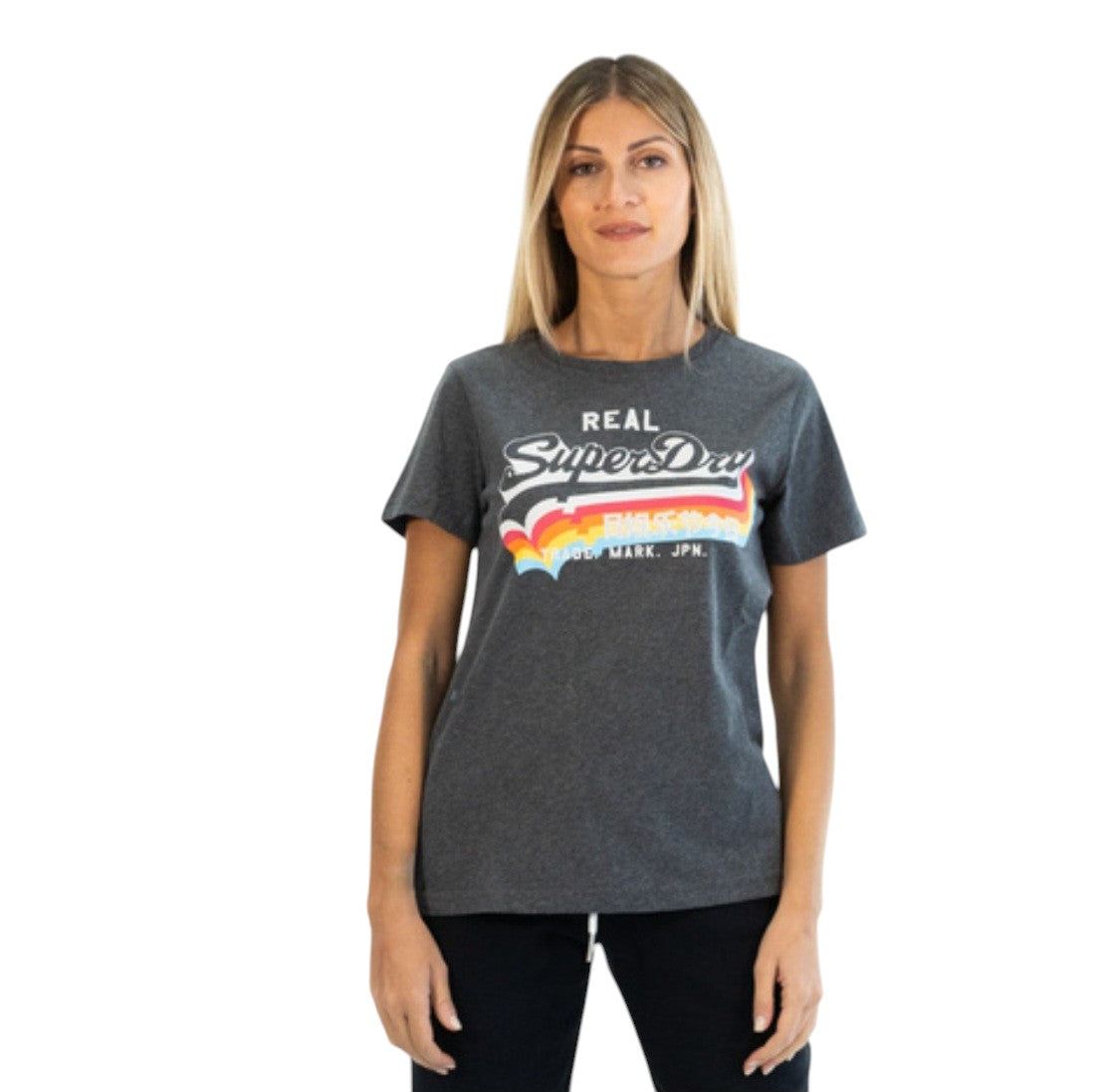Címke nélküli, sötétszürke melírozott, pamut, normál fazon, kerek nyak, rövid ujj, "REAL SuperDry" szivárványos és japán feliratos grafika.