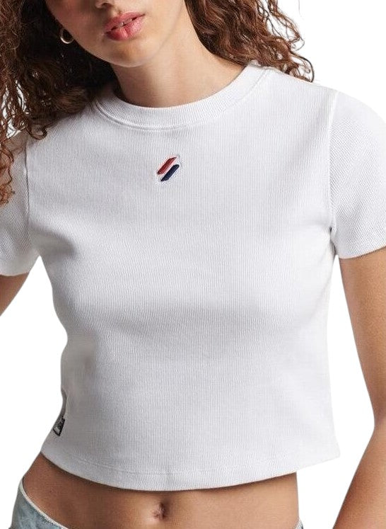 Címke nélküli, fehér, bordázott pamut, testhezálló crop top póló fazon, kerek nyak, rövid ujj, kis hímzett piros-kék-fehér logó a mellkason.