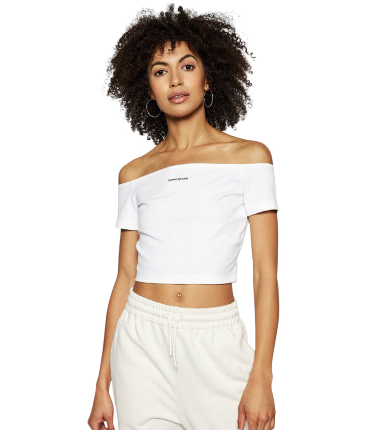 Címke nélküli, fehér, bordázott pamut, testhezálló crop top fazon, váll nélküli (off-the-shoulder), rövid ujj, kis fekete "CALVIN KLEIN JEANS" felirat.