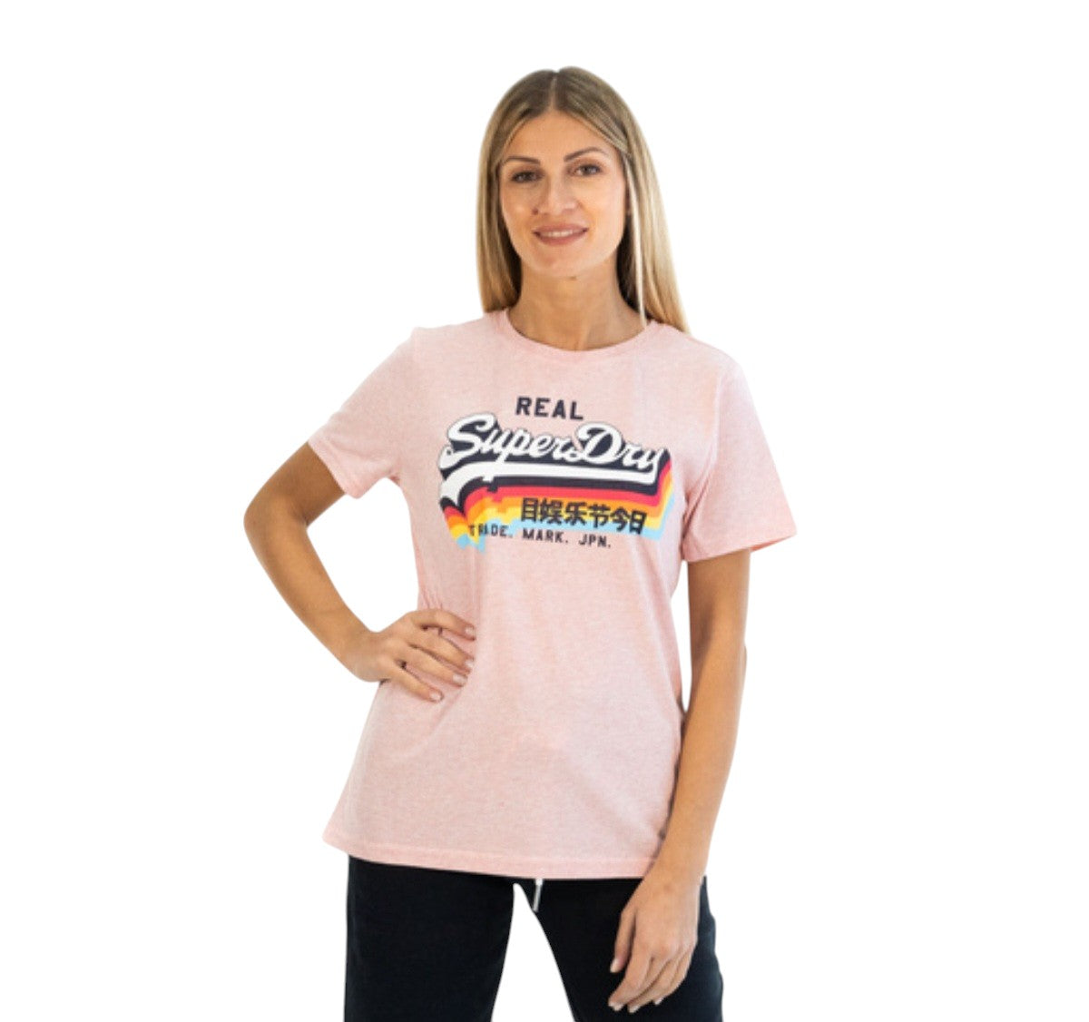 Címke nélküli, rózsaszín melírozott, pamut, normál fazon, kerek nyak, rövid ujj, "REAL SuperDry" szivárványos és japán feliratos grafika.