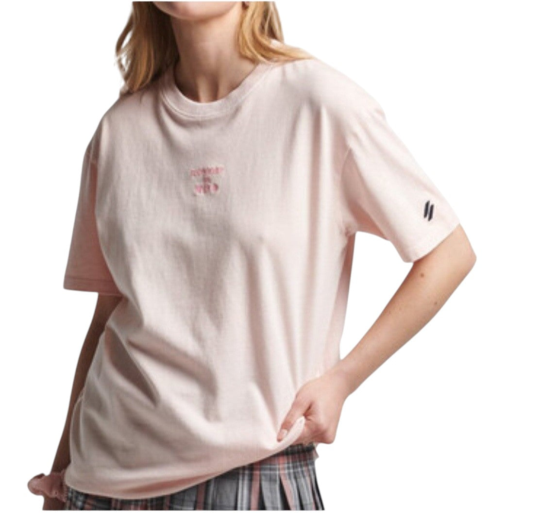 Címke nélküli, rózsaszín, pamut, oversized fazon, kerek nyak, rövid, bő ujj, hímzett rózsaszín "Summer is wild" felirat és kis logó az ujjon.
