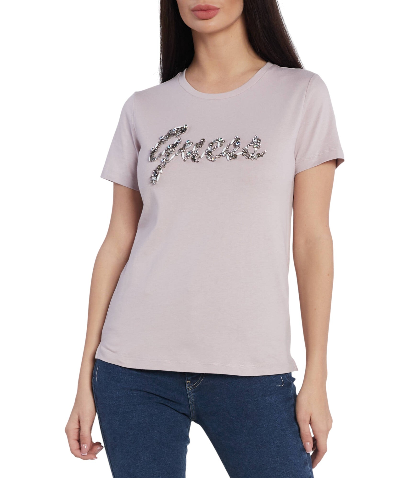 Címke nélküli, lila/mályva, pamut, normál fazon, kerek nyakkivágás, rövid ujj, flitteres logó.