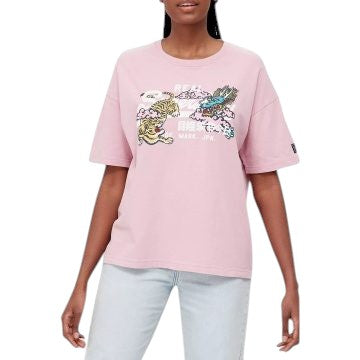 Címke nélküli, rózsaszín, pamut, oversized fazon, kerek nyakkivágás, rövid (bő) ujj, japán stílusú grafikai nyomat.