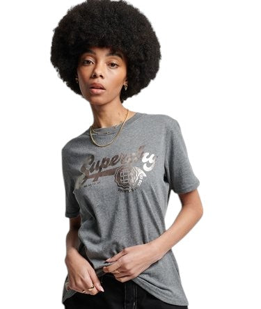 Címke nélküli, szürke (melírozott), pamut, normál fazon, kerek nyakkivágás, rövid ujj, metálfényű logó nyomat.