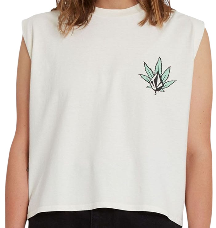 Címke nélküli, törtfehér/krém, pamut, laza/crop fazon, kerek nyakkivágás, ujjatlan (széles kivágás), kis grafika.