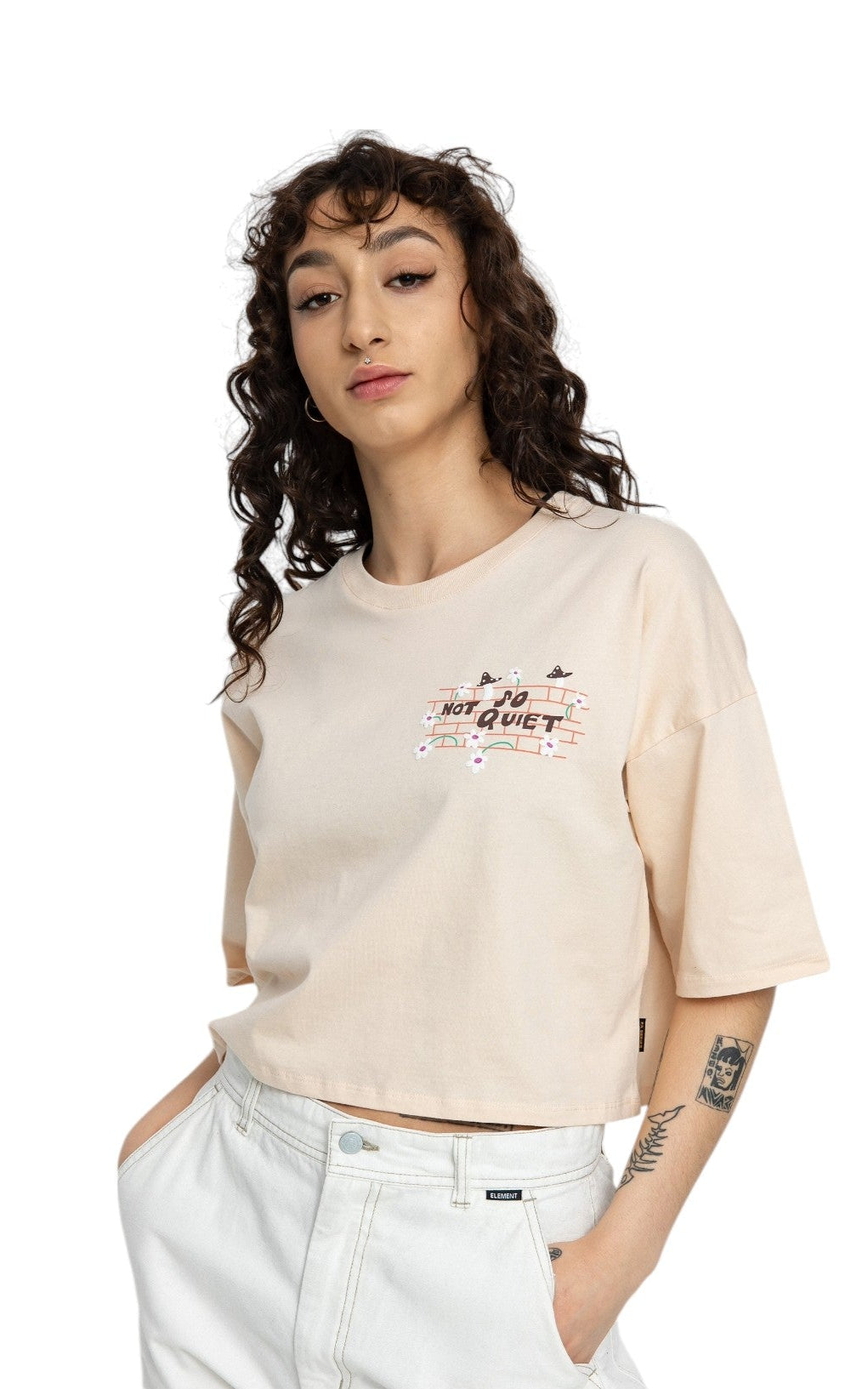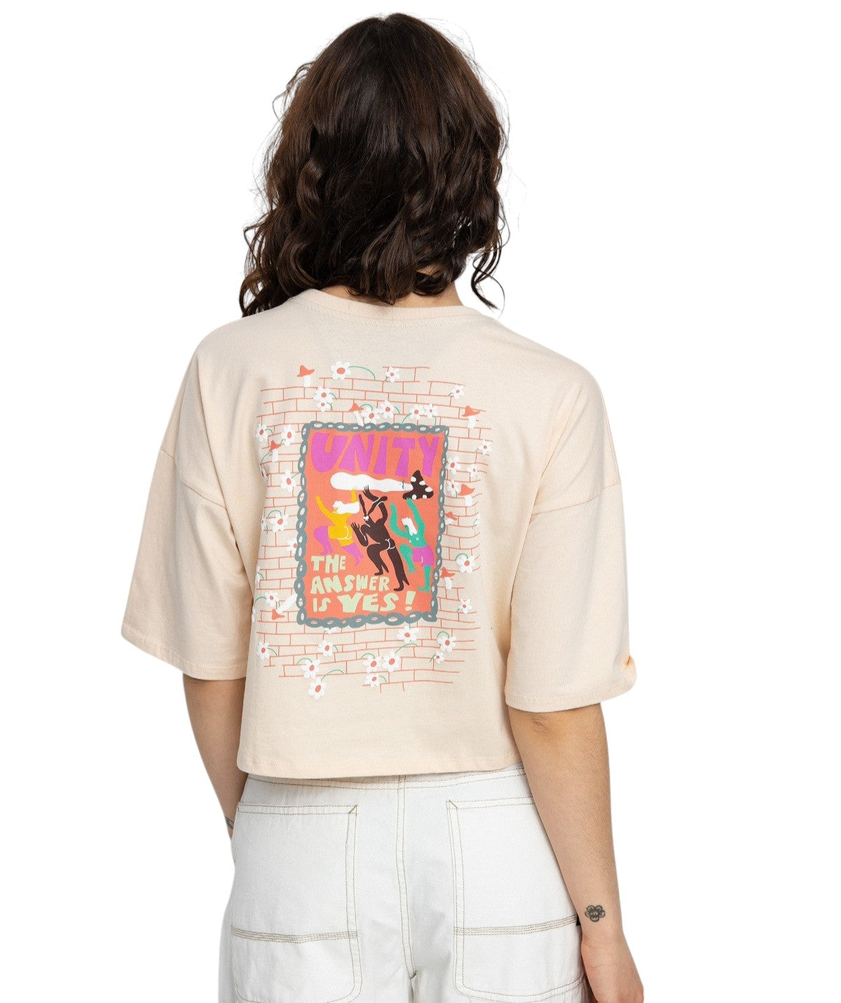 Címke nélküli, bézs/barack, pamut, laza/crop fazon, kerek nyakkivágás, rövid (bő) ujj, grafikai nyomat.