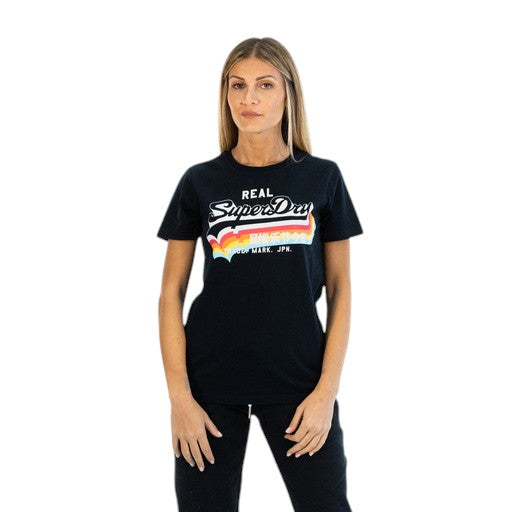 Címke nélküli, fekete, pamut, normál fazon, kerek nyakkivágás, rövid ujj, retro stílusú színes logó nyomat.