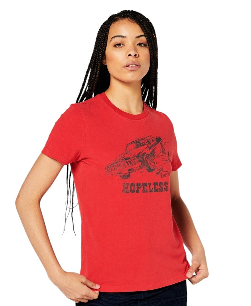 Címke nélküli, piros, pamut, normál fazon, kerek nyakkivágás, rövid ujj, autós grafikai nyomat.