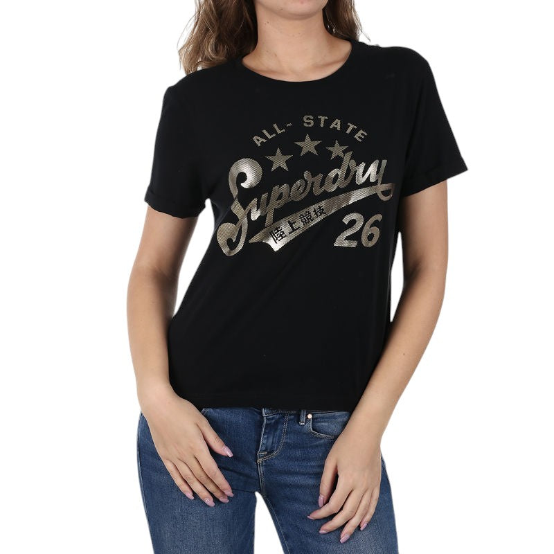 Címke nélküli, fekete, pamut, normál fazon, kerek nyakkivágás, rövid ujj, metálfényű logó nyomat.