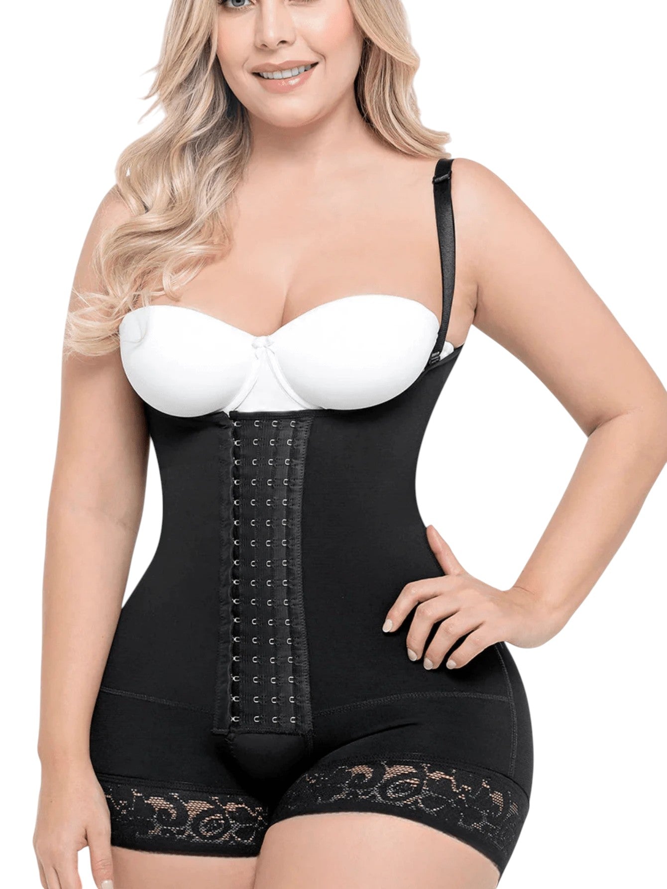 Címke nélküli, fekete, állítható vállpántos, elöl kapcsos, combközépig érő, csipke szegélyű alakformáló body