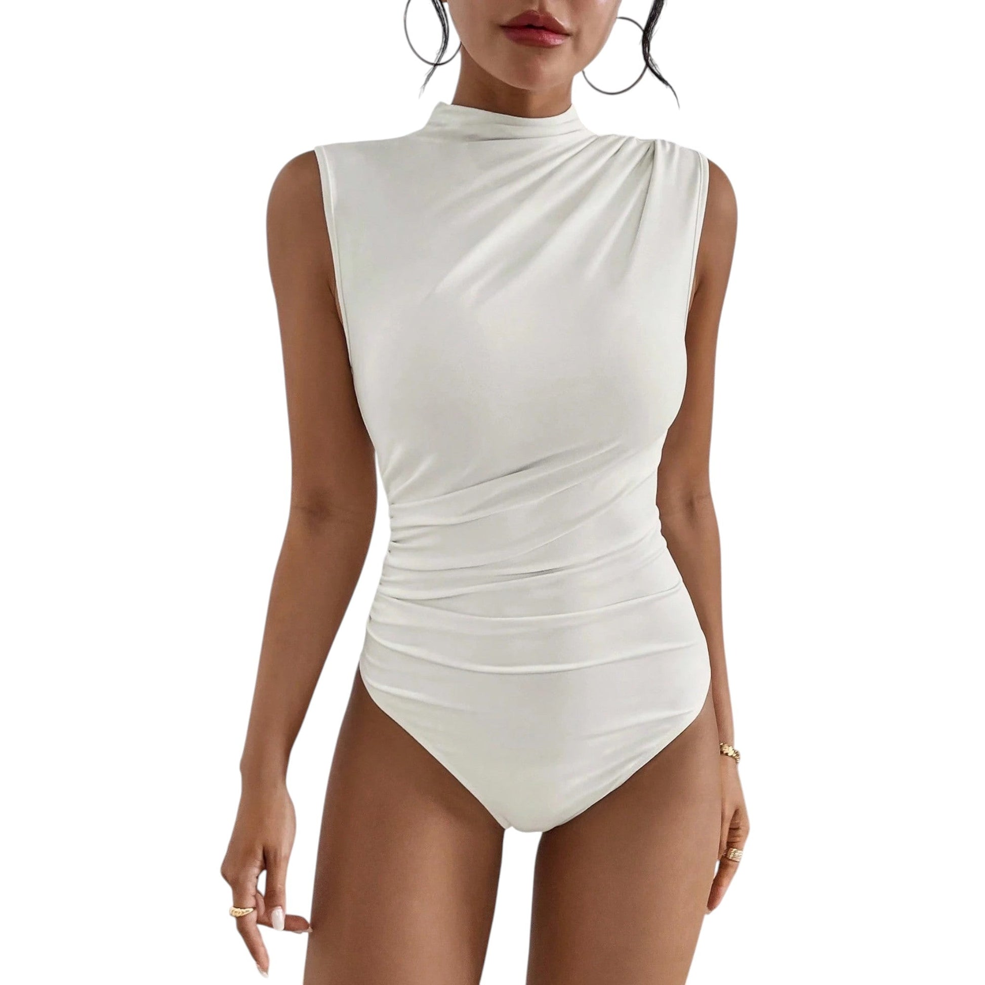 Címke nélküli, fehér, ujjatlan, magas nyakú, ráncolt oldalú, testhezálló body.