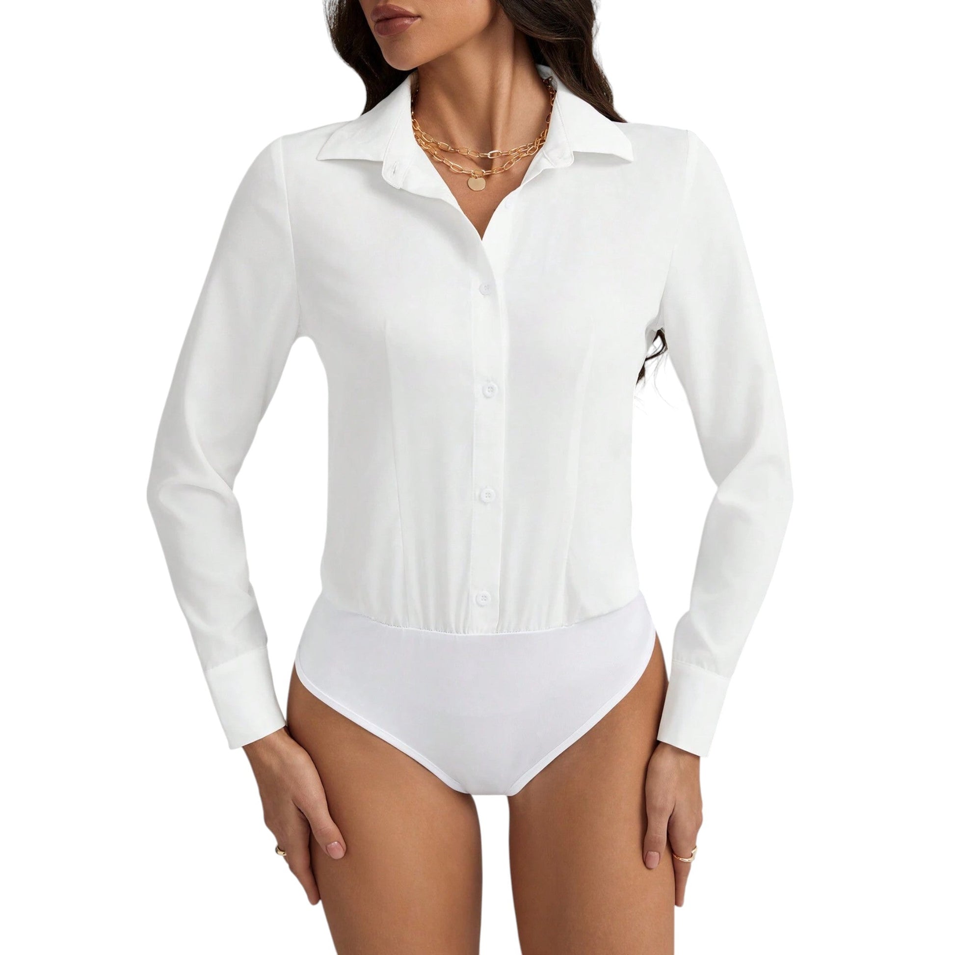 Címke nélküli, fehér, hosszú ujjú, galléros, gombos, ing stílusú body.