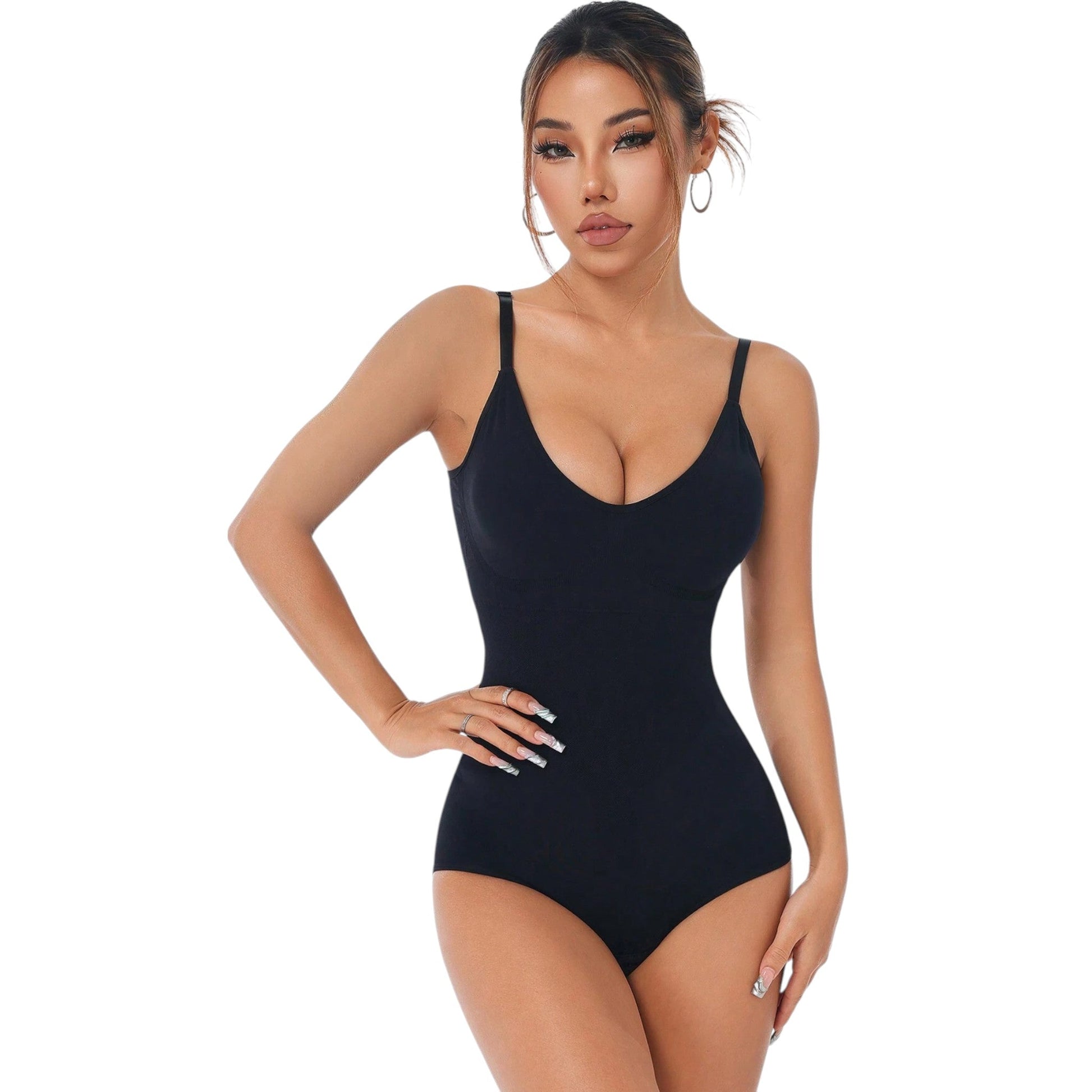 Címke nélküli, fekete színű body. V-nyakú, állítható vállpántokkal.