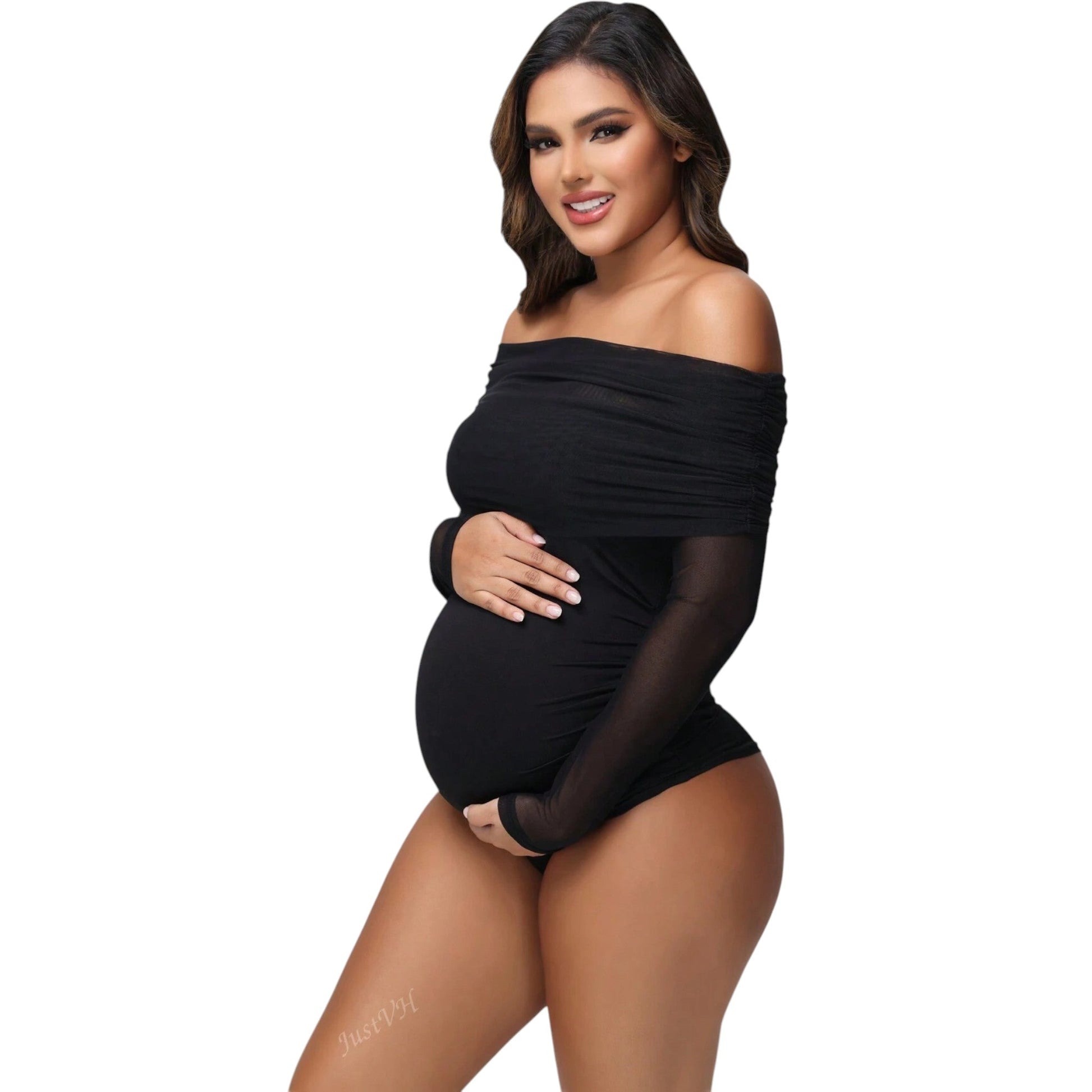 Címke nélküli, fekete, váll nélküli, hosszú ujjú, áttetsző ujjakkal, ráncolt részletek a vállon és az ujjakon, testhezálló szabású body.
