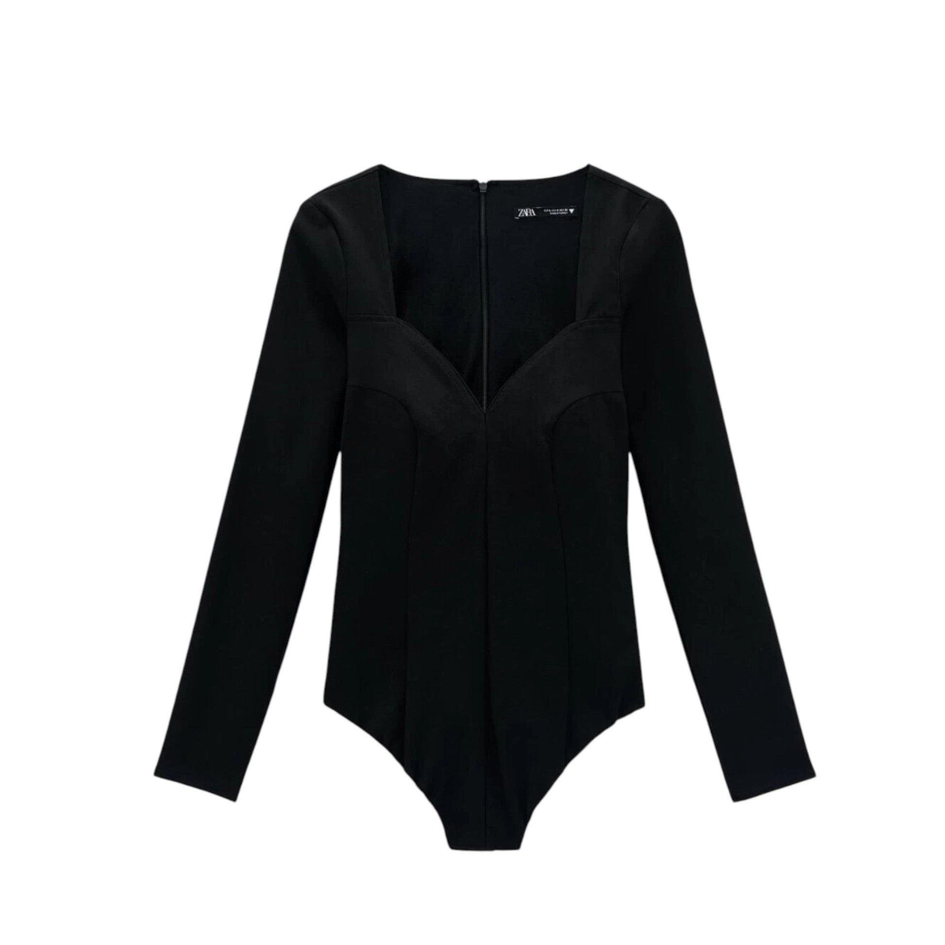 Címke nélküli, fekete, hosszú ujjú, mély, szív alakú dekoltázsú, V-kivágású, testhez simuló body.