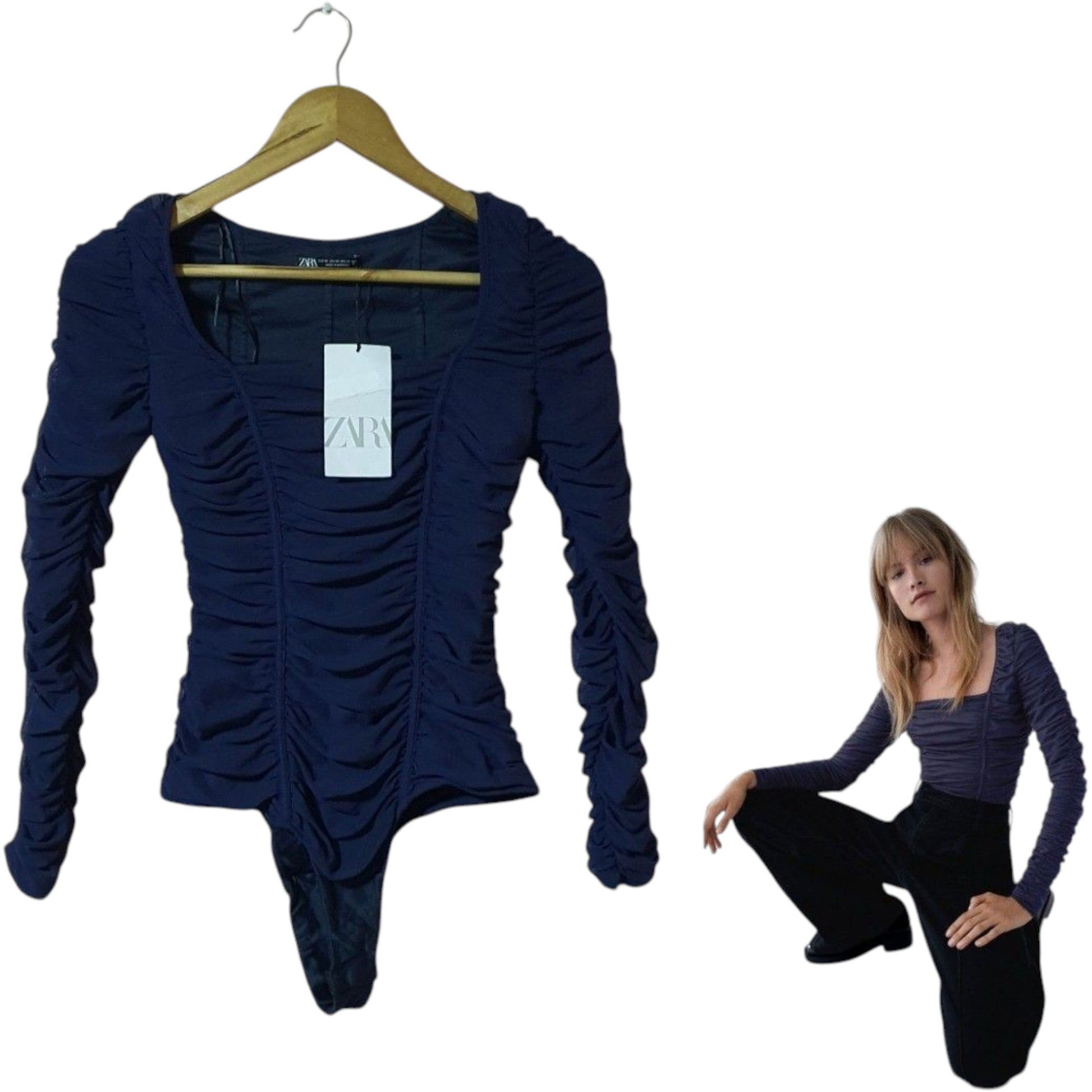 Címke nélküli, sötétkék, hosszú ujjú, szűkített szabású, négyzet alakú nyakú, elöl és az ujjakon függőlegesen ráncolt anyagú, body.