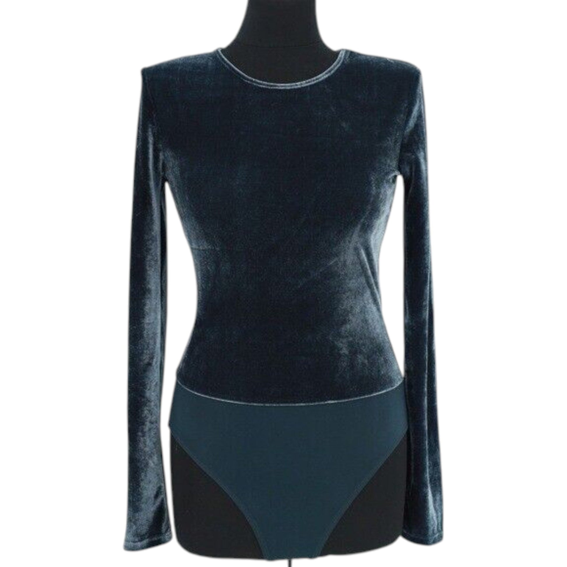 Címke nélküli, sötétkék, hosszú ujjú, kerek nyakú, bársony felsőrésszel és sima alsórésszel ellátott body.