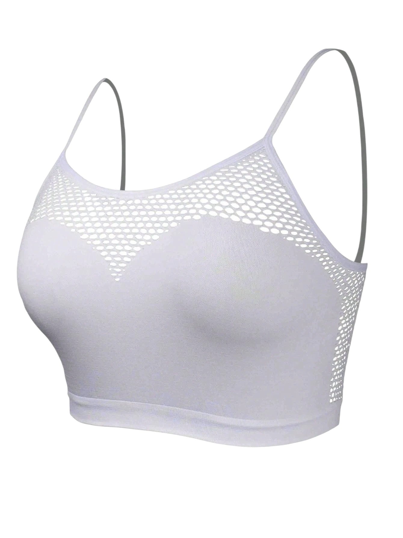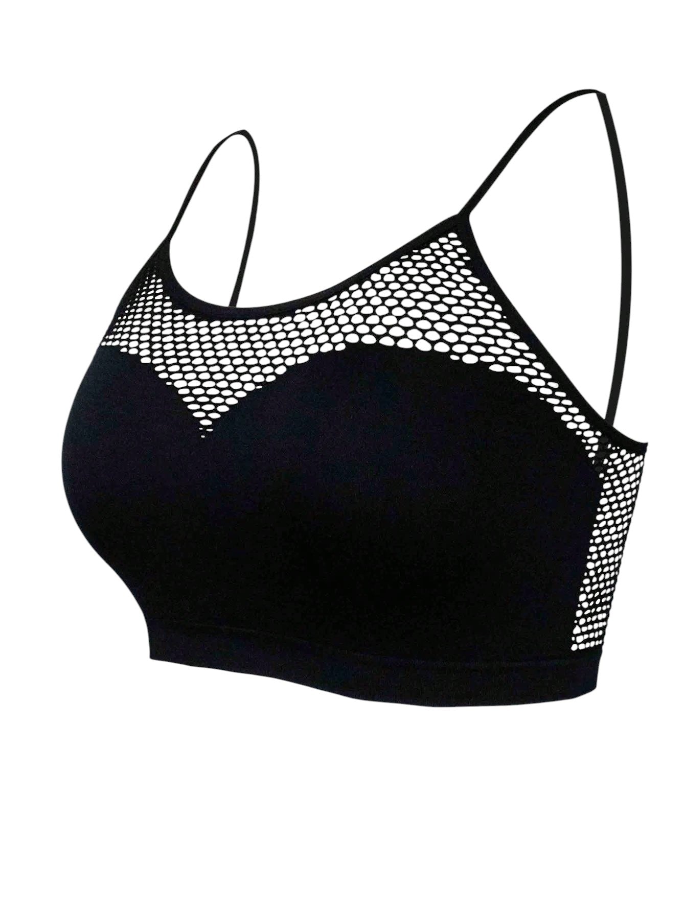 Címke nélküli, fekete, vékony pántos, hálós betétekkel díszített sportmelltartó
