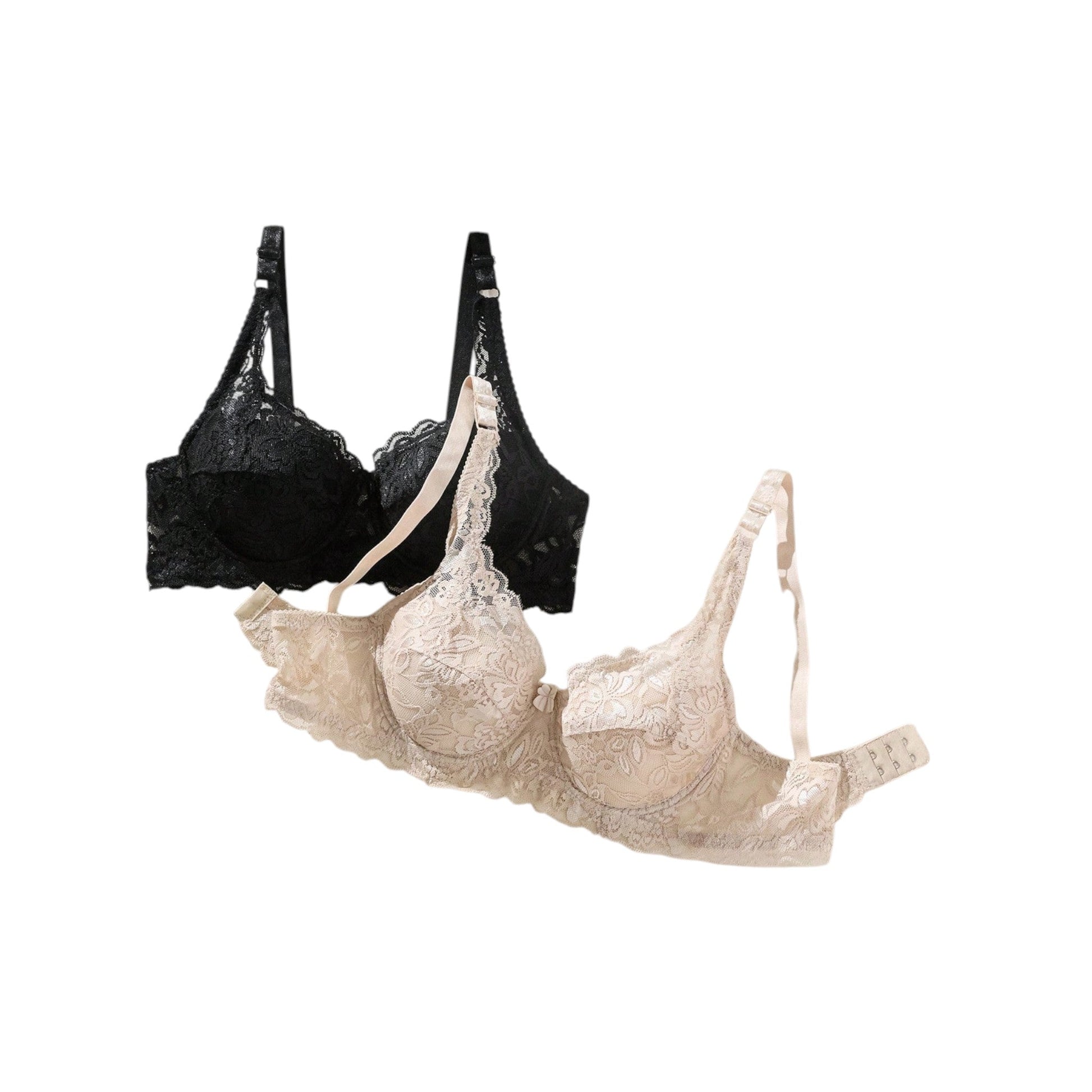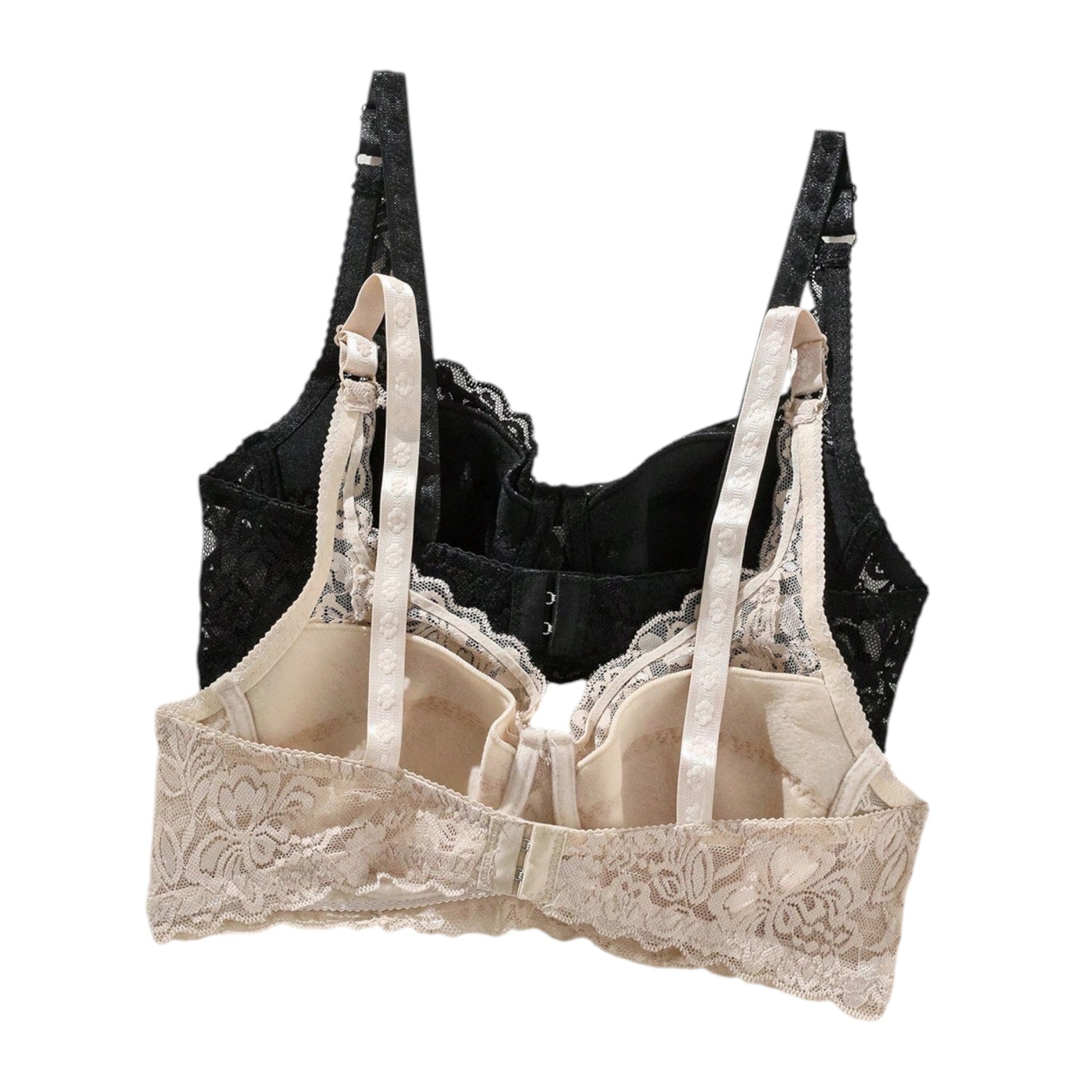 Címke nélküli, fekete és bézs színű, csipkés, merevítős melltartó szett, állítható vállpántokkal, kapcsos záródással hátul.