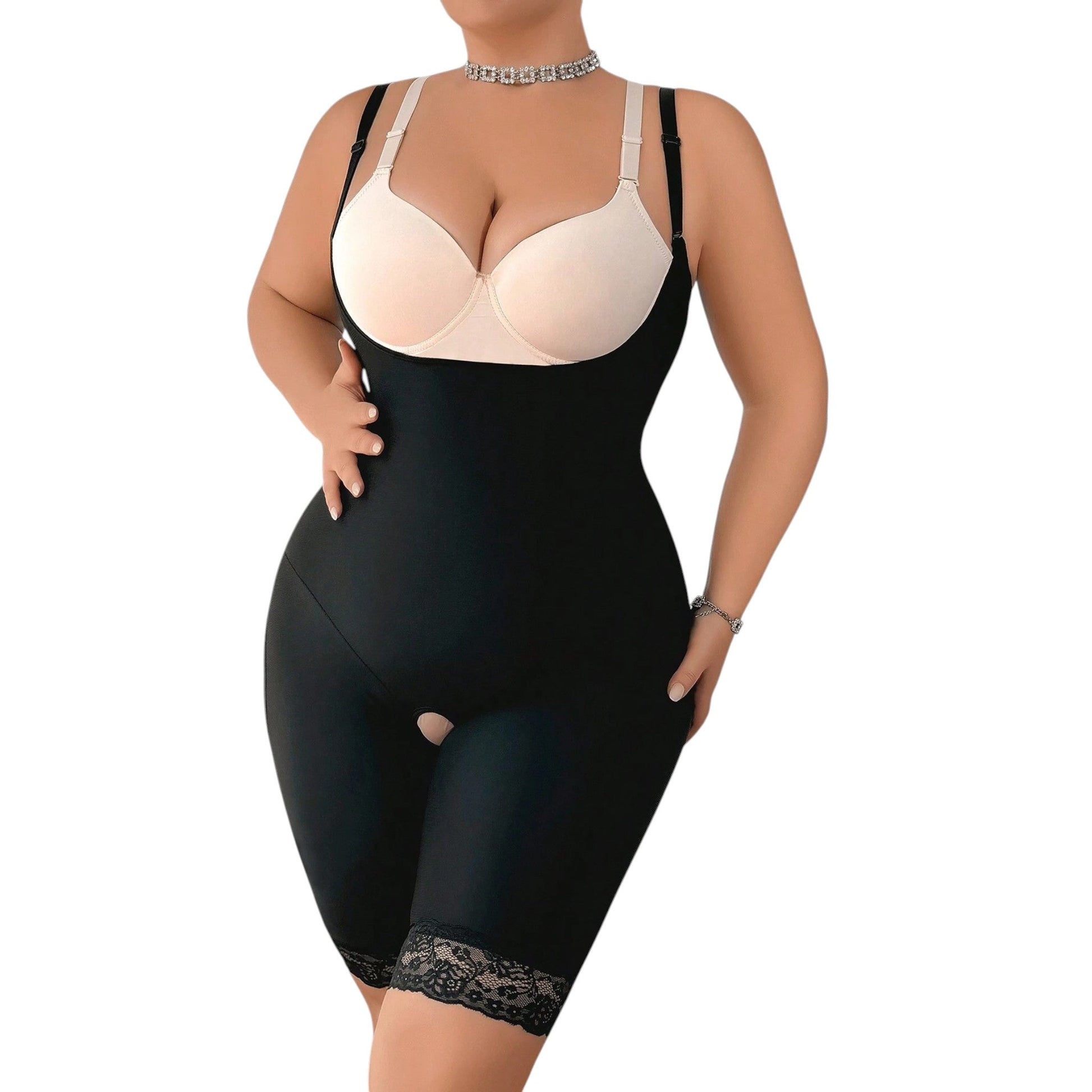 Címke nélküli, fekete, ujjatlan, alakformáló body, nyitott léparésszel, térd fölé érő hosszal, csipke szegéllyel a combnál, széles vállpántokkal.
