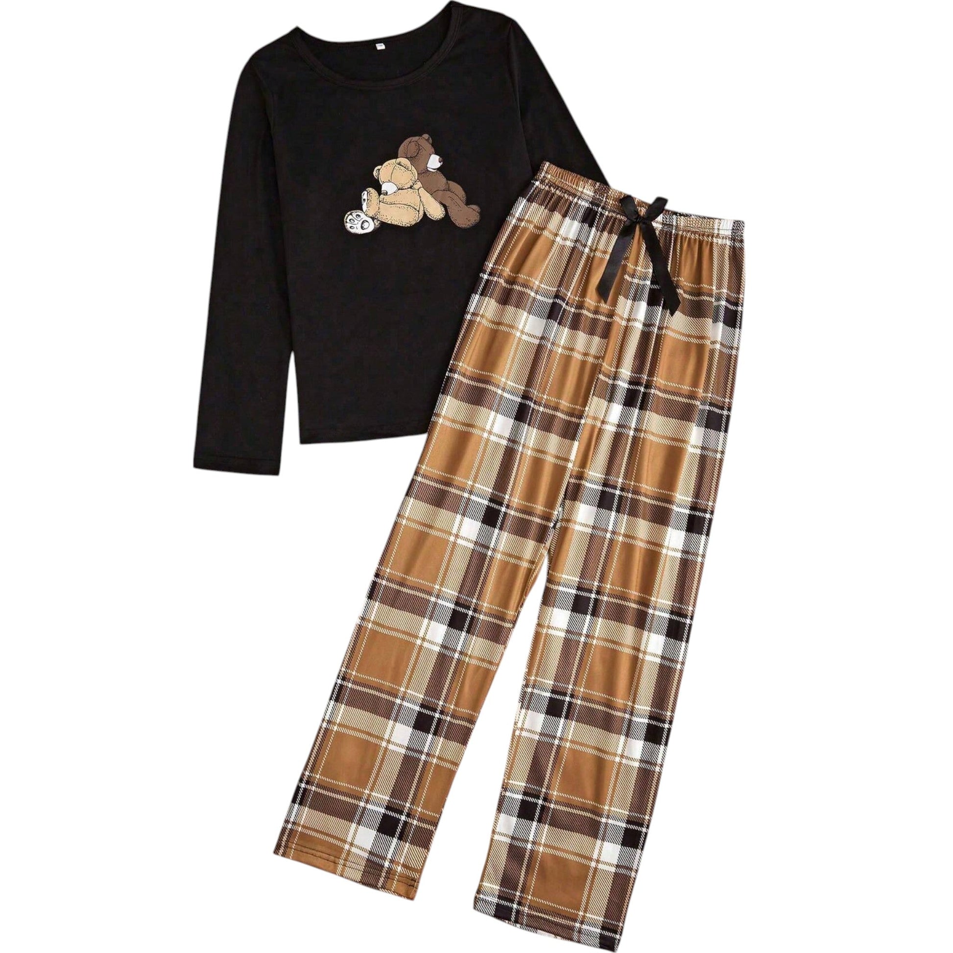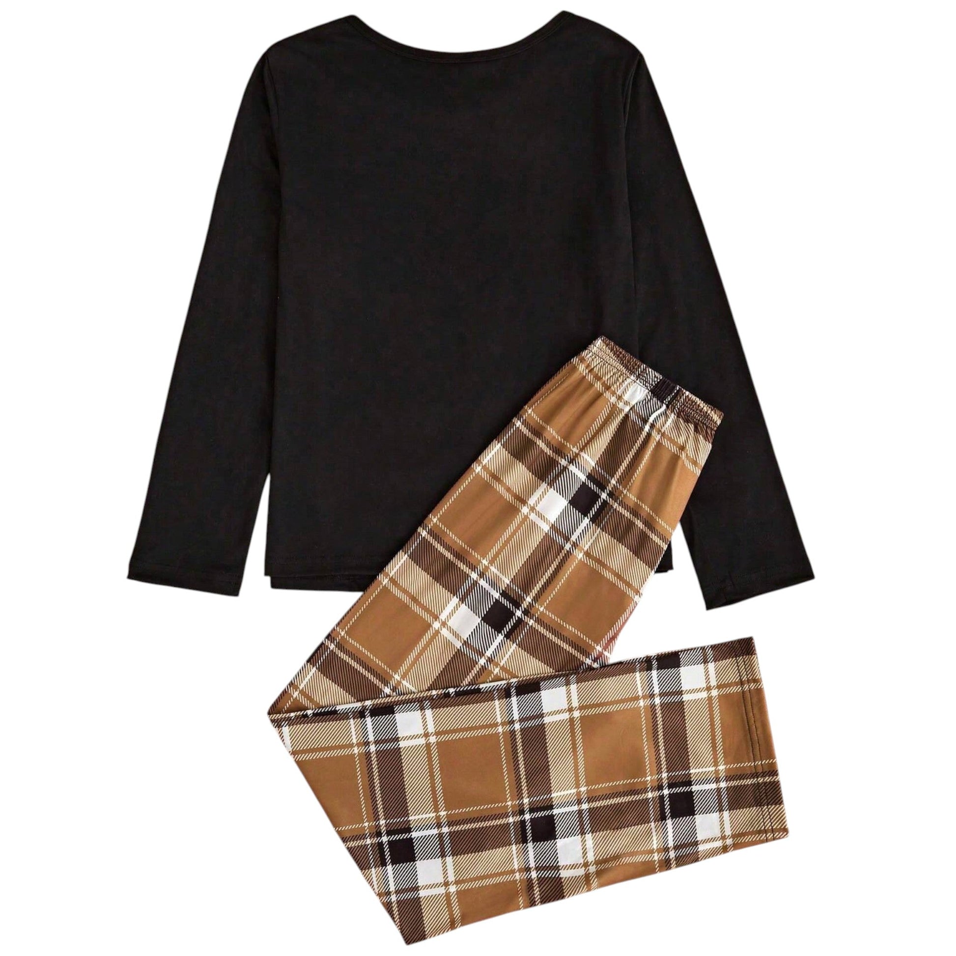Címke nélküli, fekete, hosszú ujjú felső és kockás, hosszú nadrág pizsama szett.