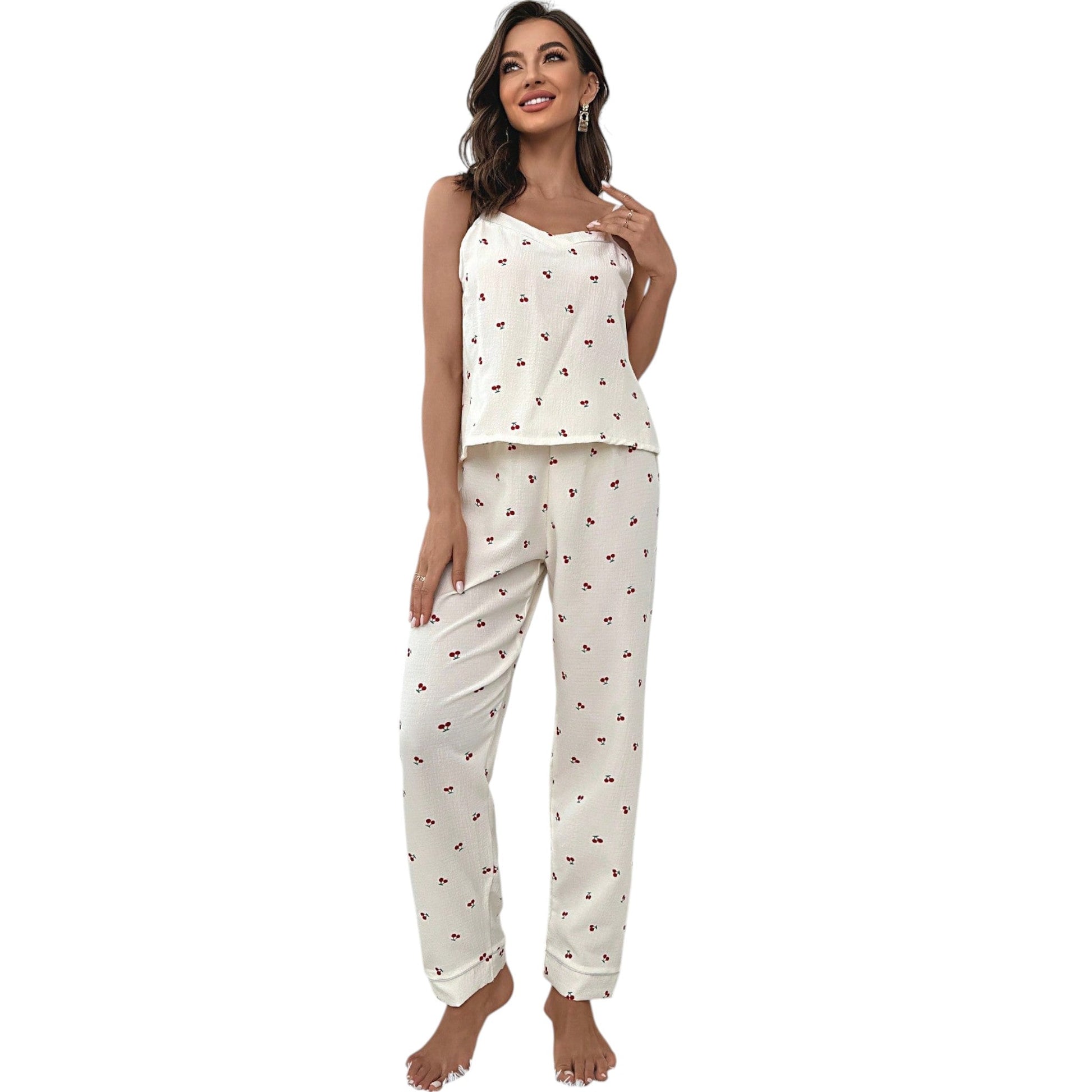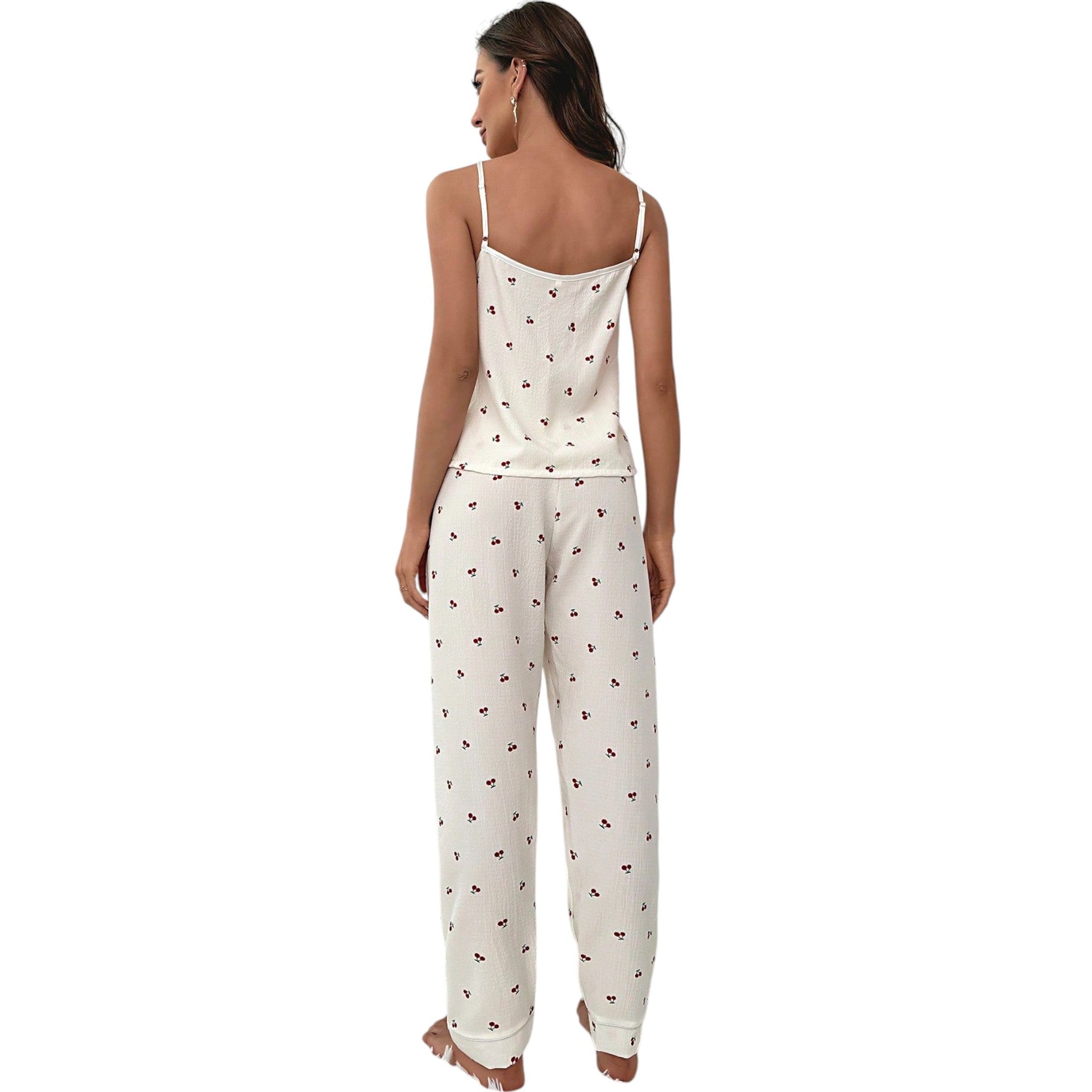 Címke nélküli, fehér, cseresznye mintás, spagetti pántos felső és hosszú nadrág pizsama szett.
