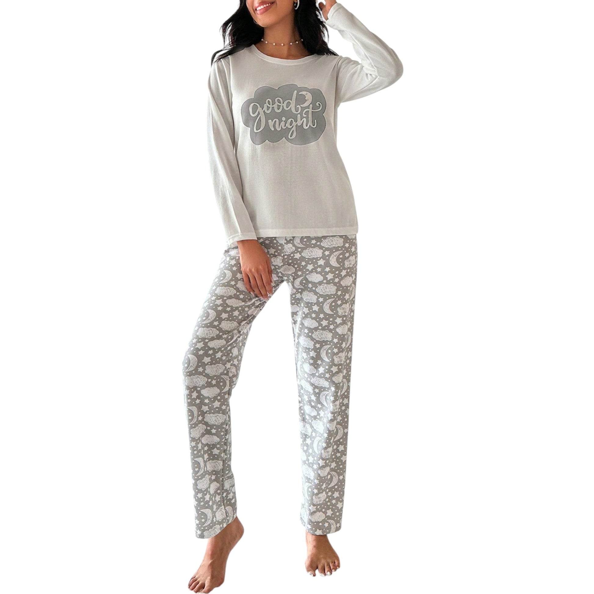 Címke nélküli, fehér, hosszú ujjú felső és mintás nadrág, "good night" feliratos.