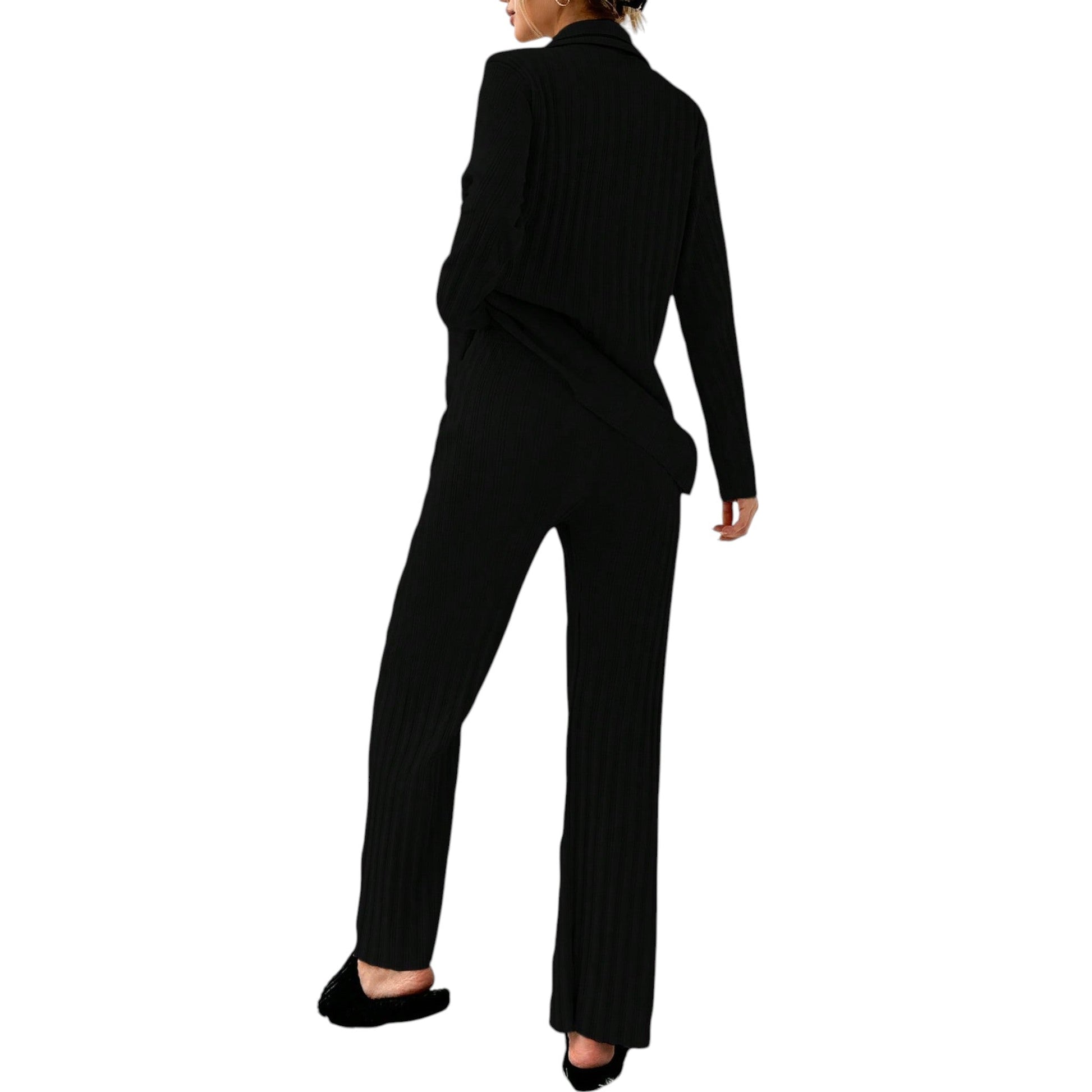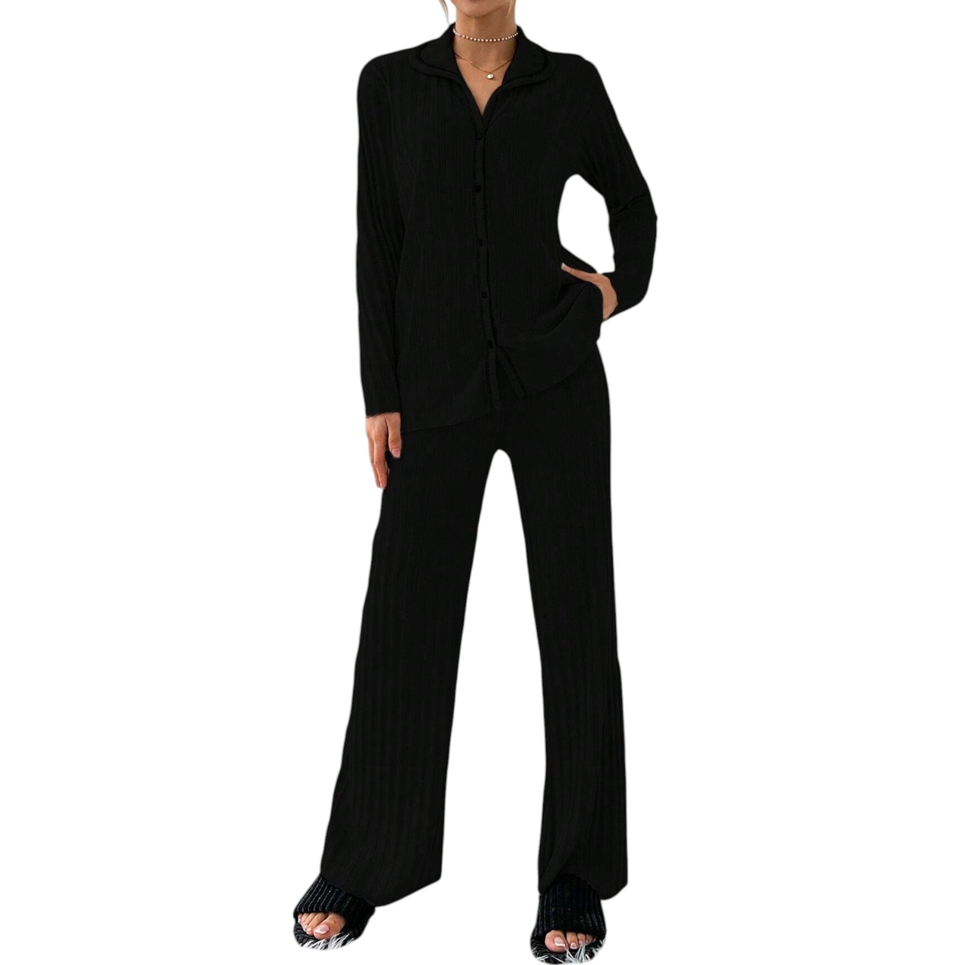Címke nélküli, fekete, kötött, hosszú ujjú ing és bő szárú nadrág szett.