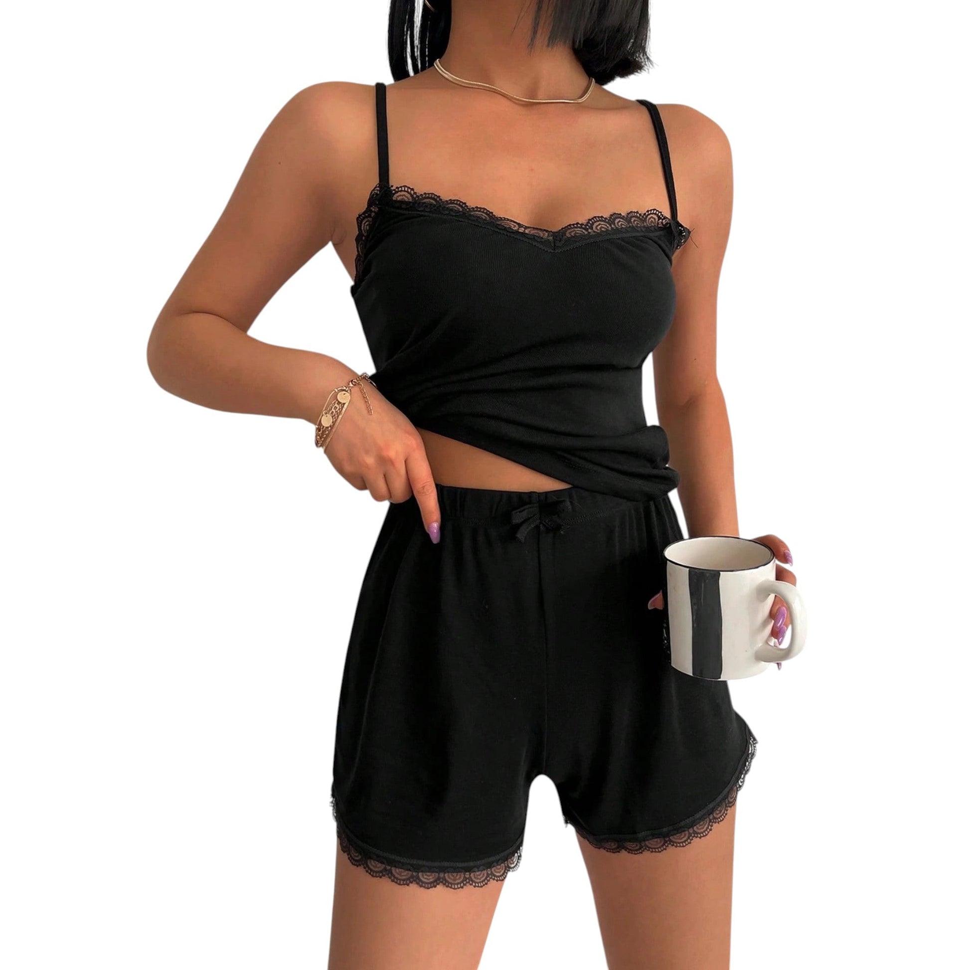 Címke nélküli, fekete, kétrészes pizsama szett, spagettipántos felsővel és rövidnadrággal, mindkét darabon csipkés szegéllyel, a nadrág gumis derekú és elöl masnival díszített.