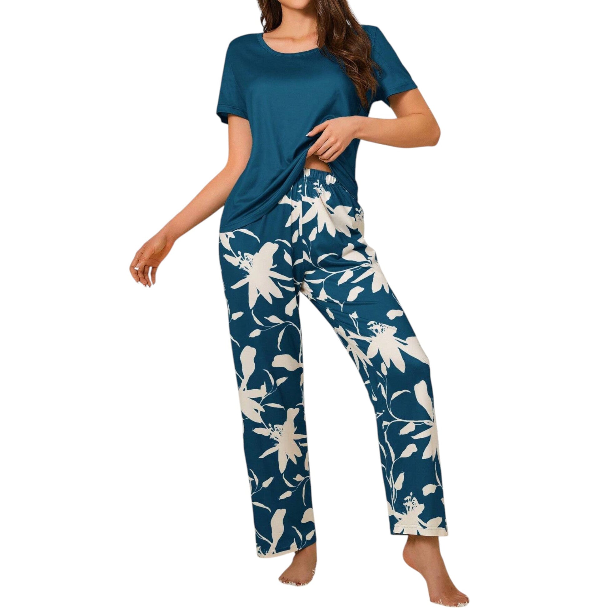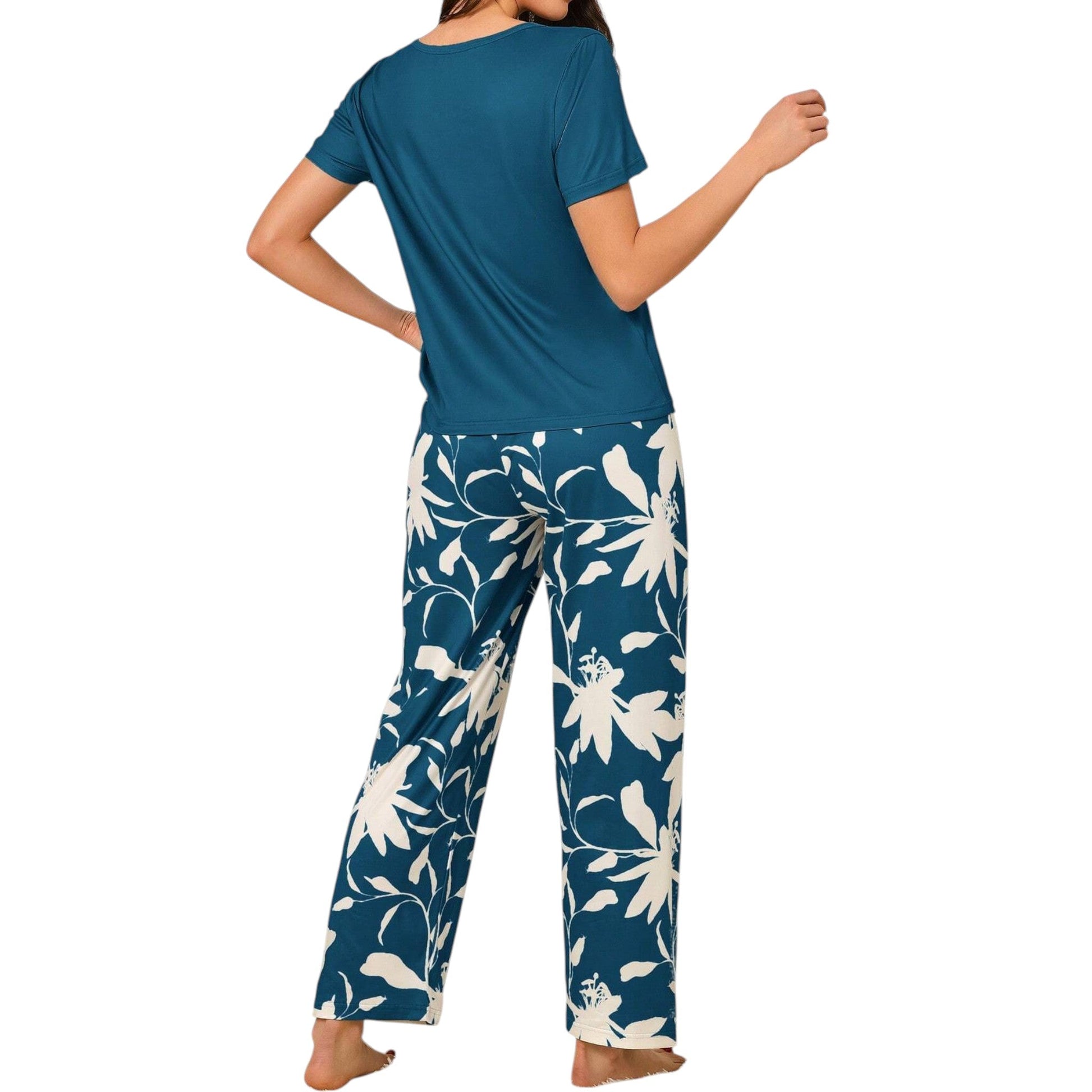 Címke nélküli, kék és fehér, virágmintás pizsama szett, rövid ujjú, kerek nyakú felsővel és hosszú, egyenes szárú, virágmintás nadrággal.